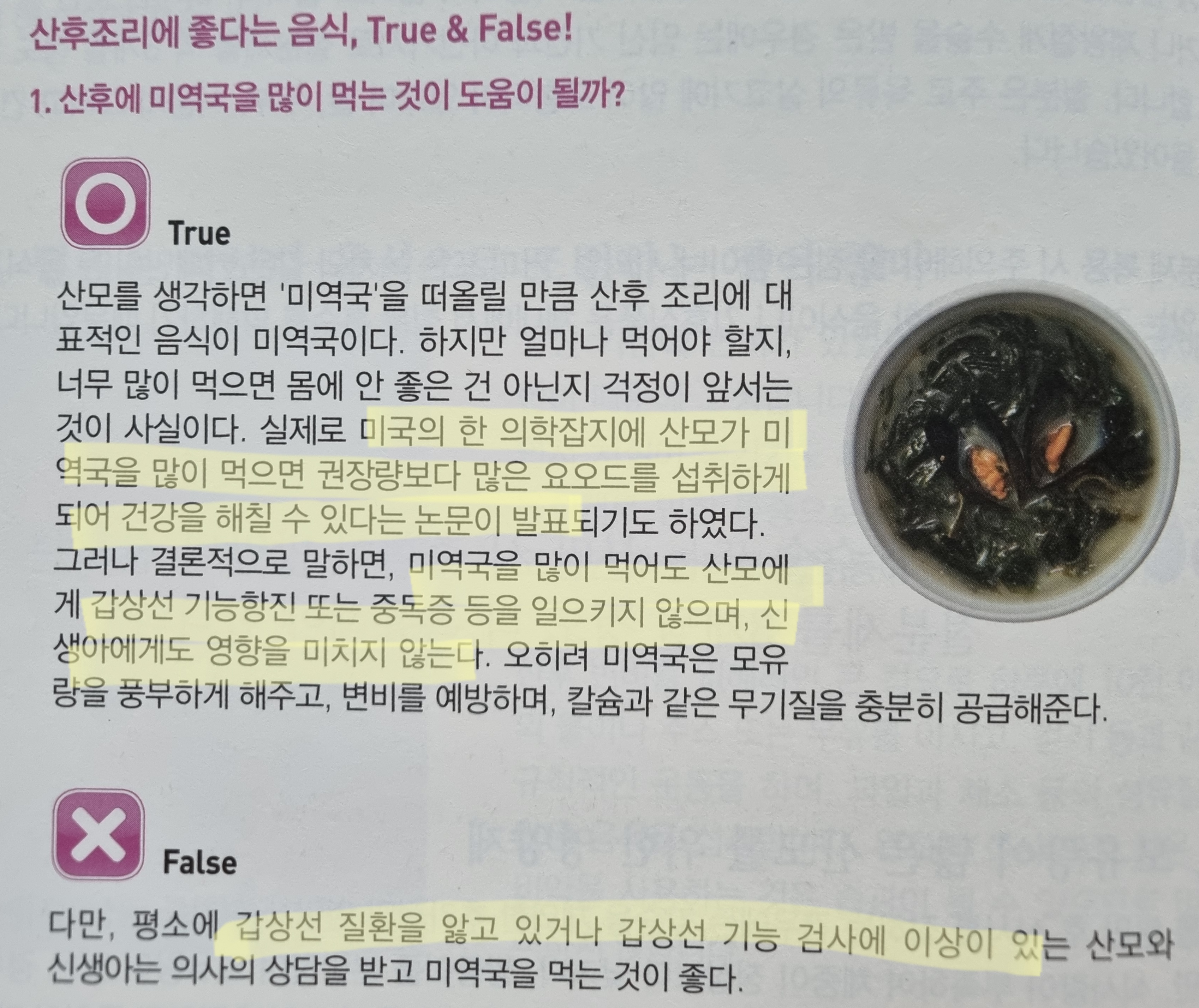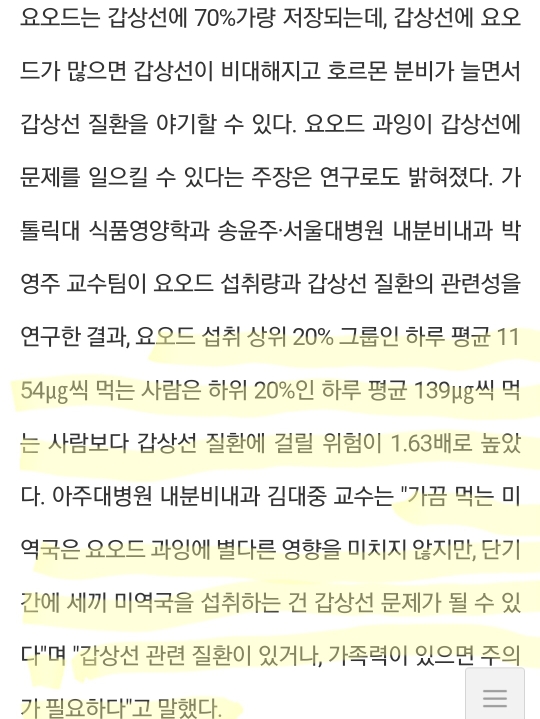 견해 1. 미역국 과다 = 과다 요오드 섭취로 이어지긴 하나 갑상선 질환을 유발하지 않는다. 다만, 갑상선 질환을 앓고 있는 경우라면, 주의!