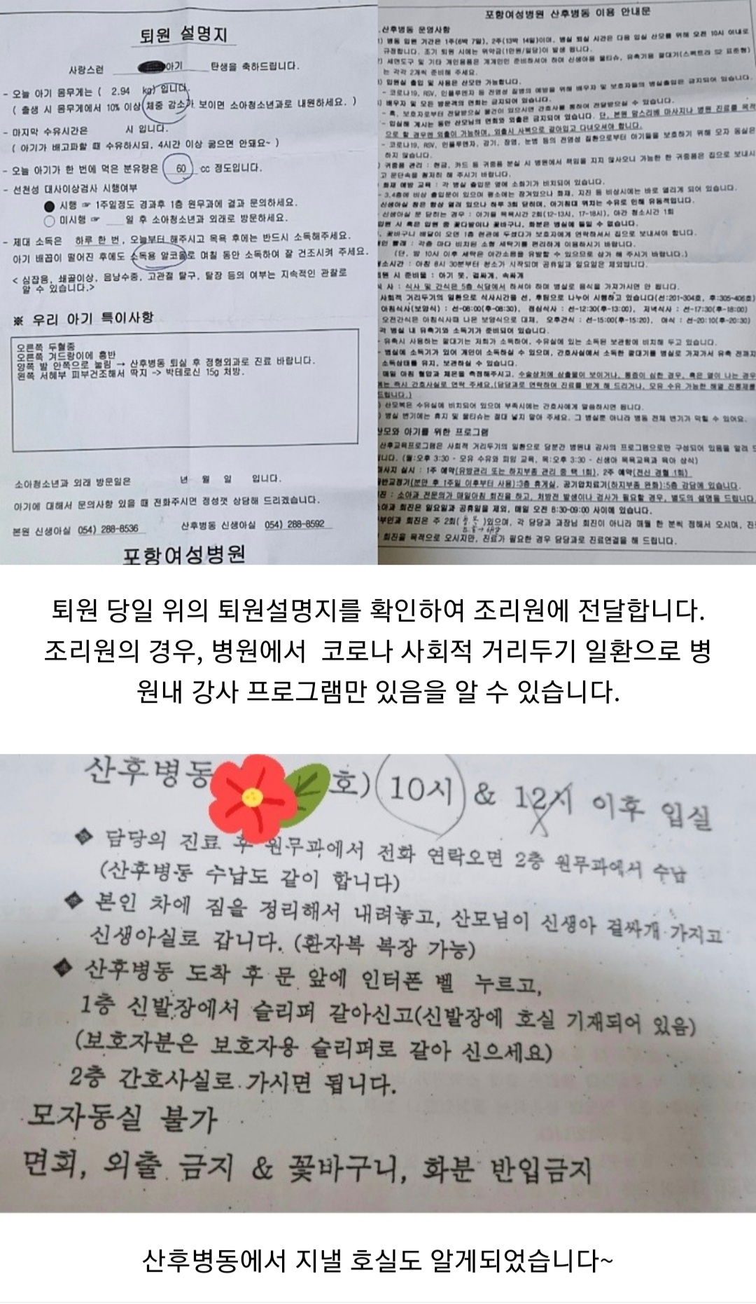 둘째와 함께 다시 만난 포항여성병원과 산후병동은 첫째 때 계시던 간호사님들, 의사선생님이 계셔서 2년 만인데도 여전히 좋으신 모습에 너무 반가우시고(환자인 저는 못 알아보실까봐 혼자 조용히 맘속으로 반가워하다 마지막에 둘째라고 인사드렸네요~다시 또 못뵐거같아 괜히 혼자 눈물이 찔끔 났네요.. )