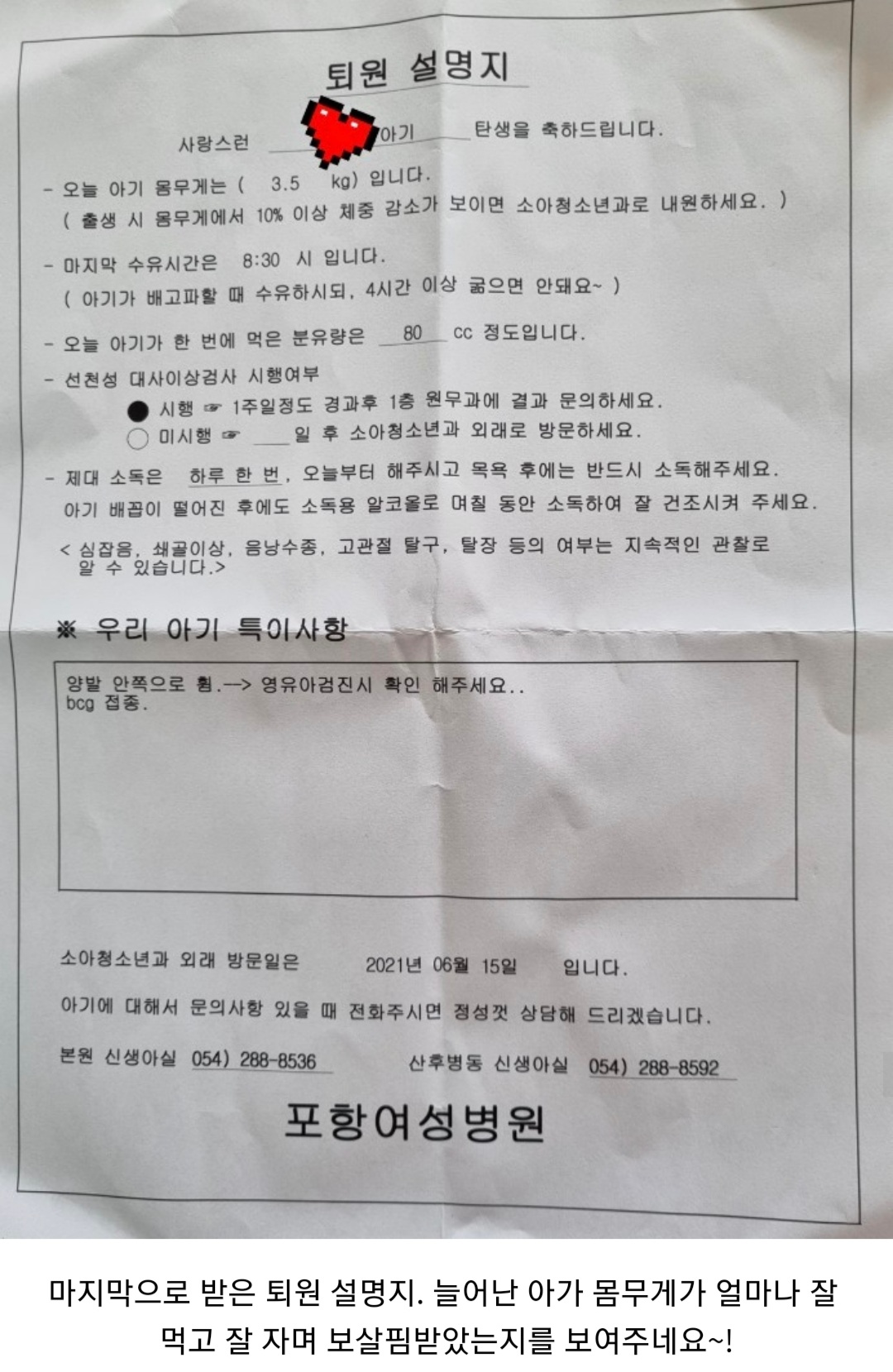 퇴소전날, 다시 한 번 퇴원교육을 받고 퇴소날, 퇴원설명지를 받습니다. 아가의 몸무게, 수유량 및 특이사항을 간호사선생님과 함께 확인하고, 설명듣구요. 조리원에 올때 2.9kg대였던 몸무게가 3.5kg로 늘고 수유량도 80cc로 늘었네요. 쑥쑥 자란 모습에 엄마는 또 감동합니다 ㅠㅠ♡