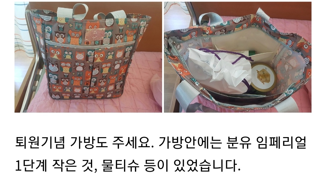수술 경과를 살피기 위해 2시간에 1번 이상 간호사님이 들르셔서 혈압, 열 측정, 자궁오로배출을 위한 배 눌러주기, 오로패드 교체 등을 해주셨어요... 이때 훗배앓이가 정말 아파요. 페인버스터 신청여부를 물어봐주셔서 미리 효과가 좋다고 알고 있던 터라, 신청했습니다! 경산모는 훗배앓이가 더 심하다고 하는데 사람마다 다른지, 저는 첫째 때보다 훗배앓이가 덜한 것 같다고 느꼈습니다.
