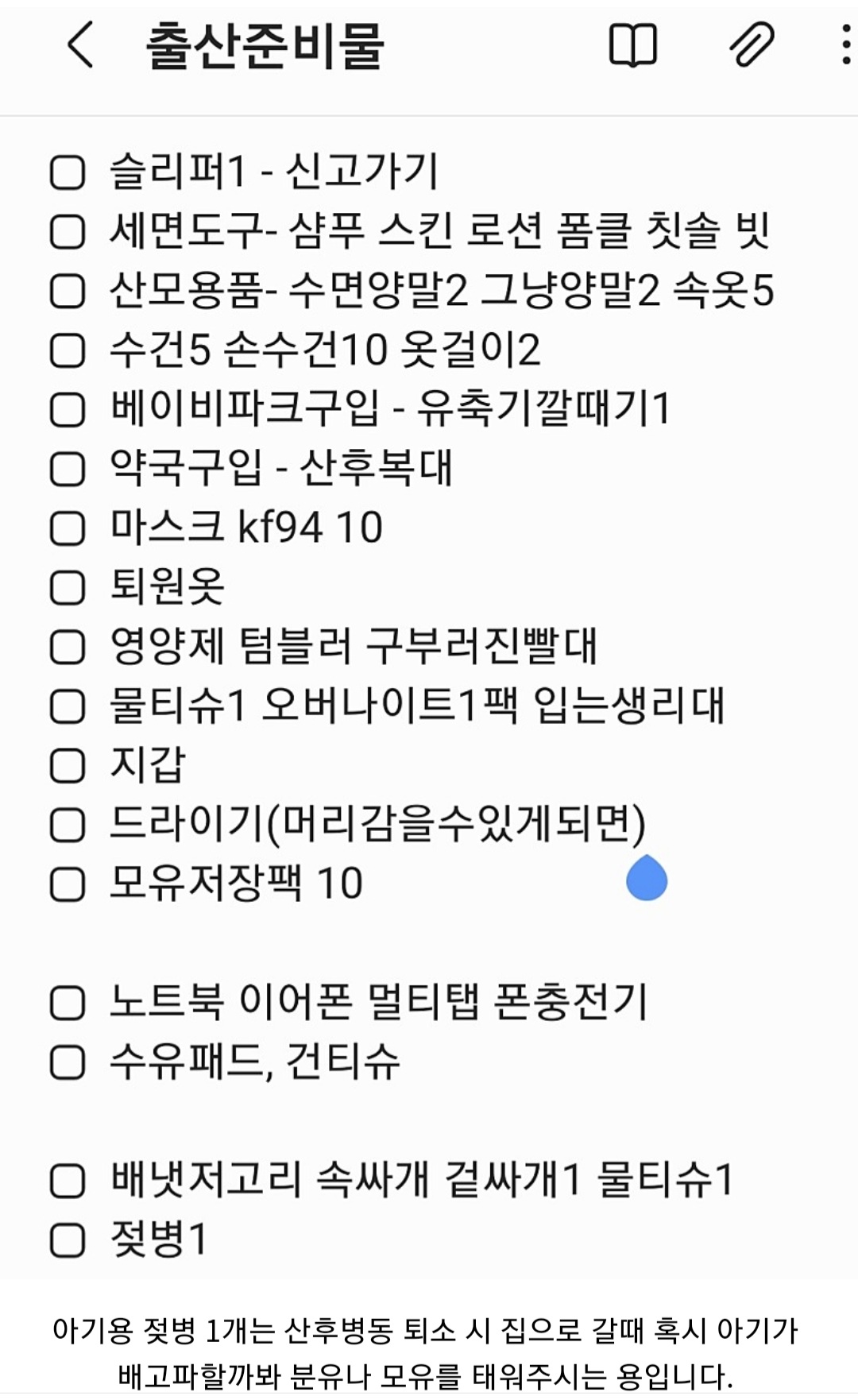 혹시 참고되실까, 제가 챙겼던 출산준비물 리스트도 첨부해봅니다. 첫째때는 남편이 여러번 챙겨다 줬는데, 두번째는 챙길 것 챙기고 뺄 것 빼서 남편이 따로 가져다 준 물품이 없었어요 ㅎㅎ 하지만 빠진 것이 있을 수도 있으니 참고하셔서 챙기세요~
