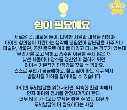 * 인터넷에서 이것저것 보다 찾은, 참고해도 좋을 내용이에요! 늘 새로운 곳을 데려다주지 못해 죄책감을 가지셨던 저와 같은 부모님들~ 무거운 마음 다 내려놓으시고 아기와 눈을 맞추는 시간을 좀 더 늘리시고 규칙적인 일과와 수면, 기초에 무게 두셔도 좋을 것 같아요!