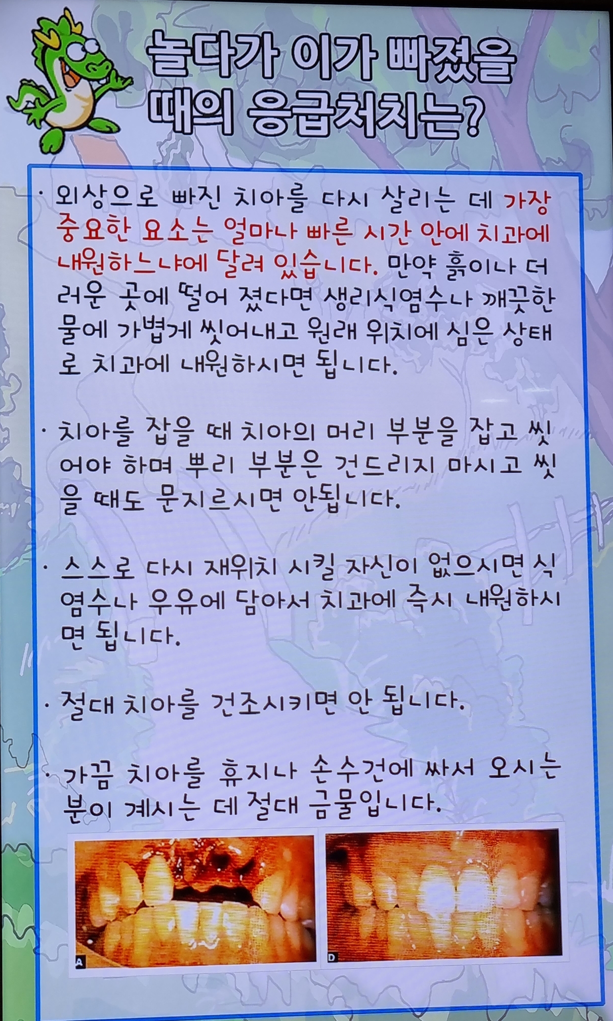 - 혹시 모르니 다친 후 바로 치과에 가서 검진받아보는 걸 권하더라.