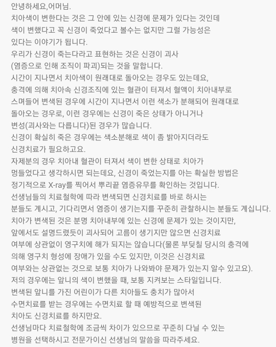 신경이 죽으면 치아색이 회색이나 갈색 등 변색이 서서히 진행됩니다요~