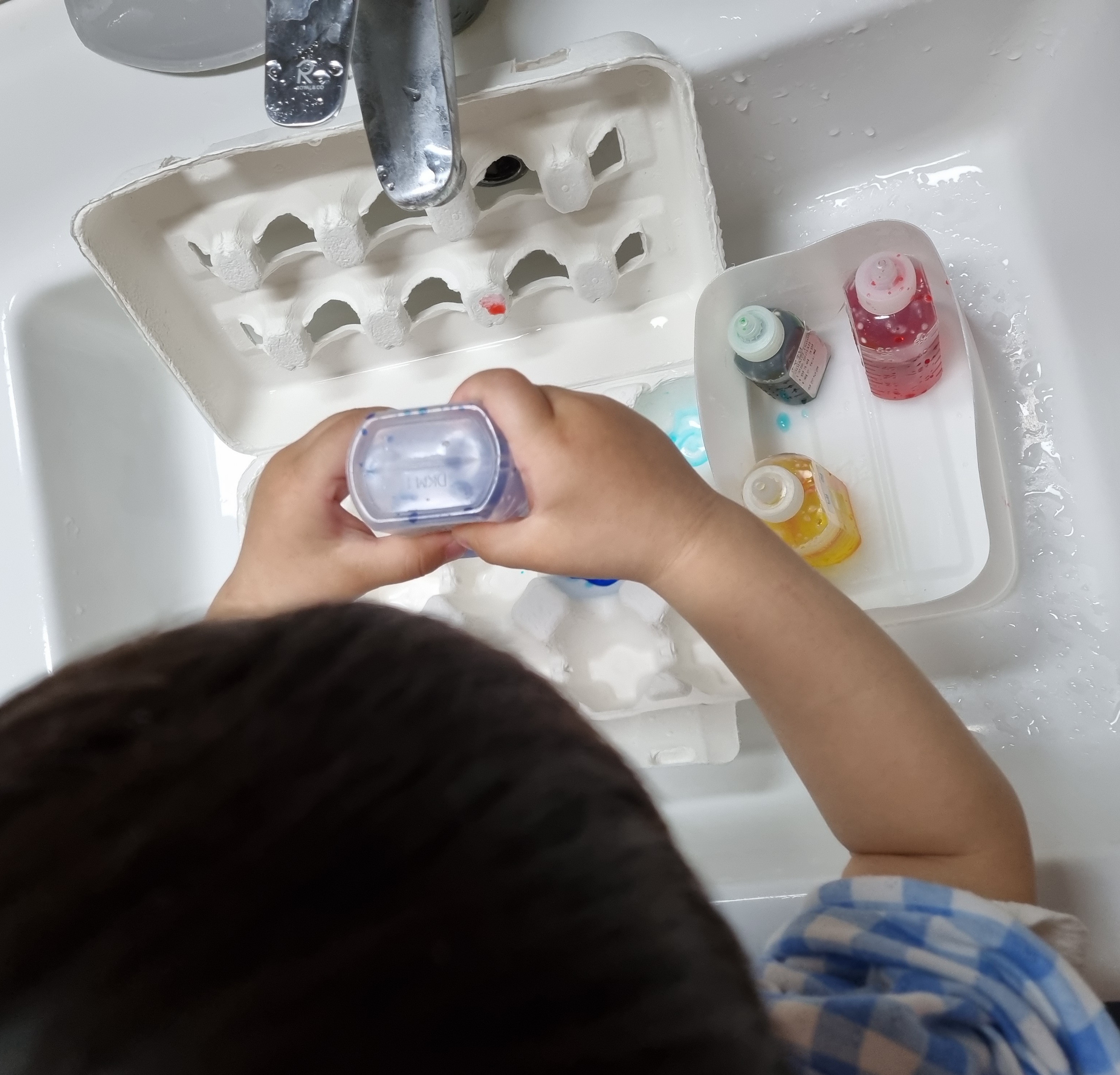 아이로 하여금 놀이한 물약병 헹구게 하기