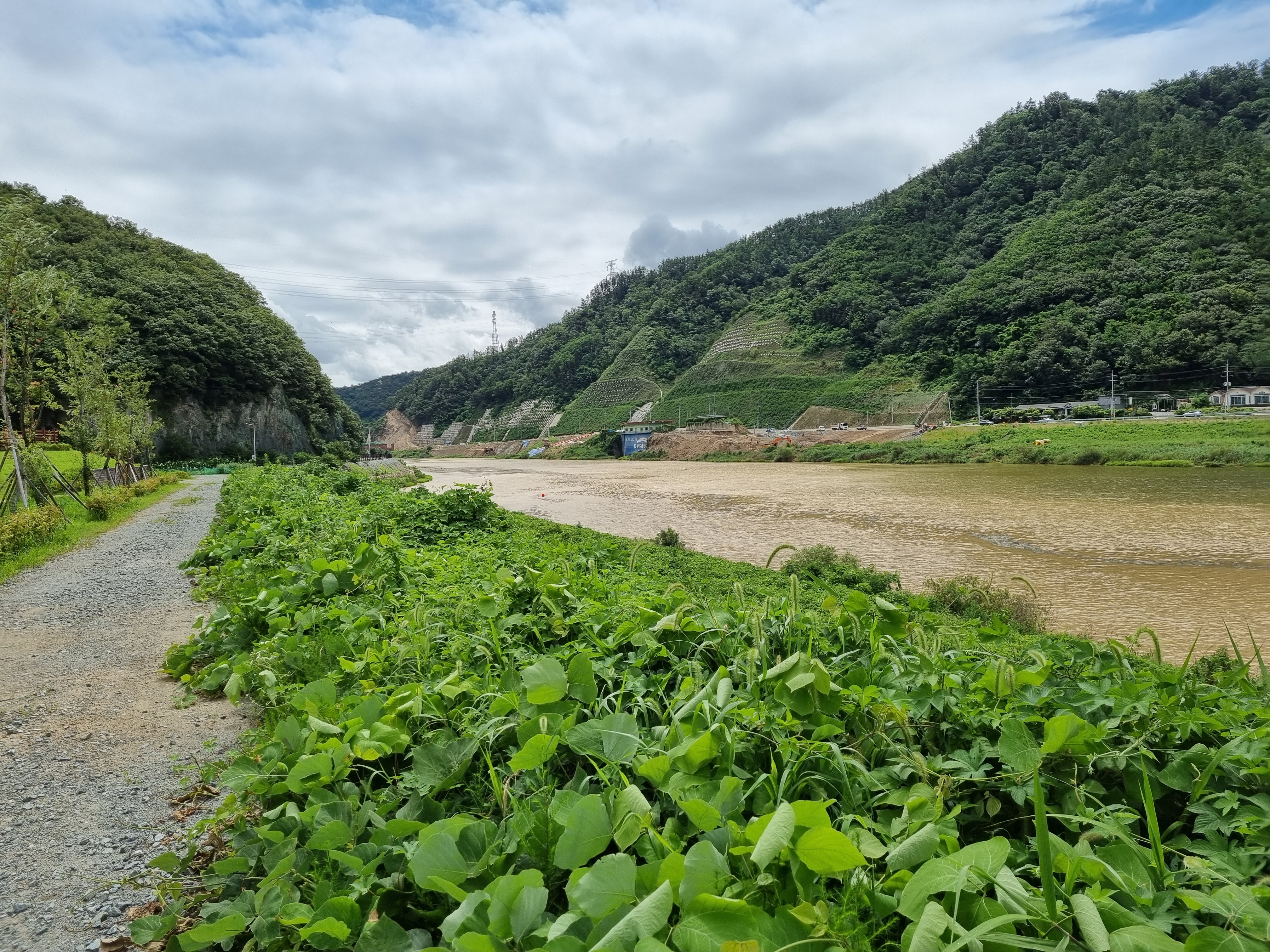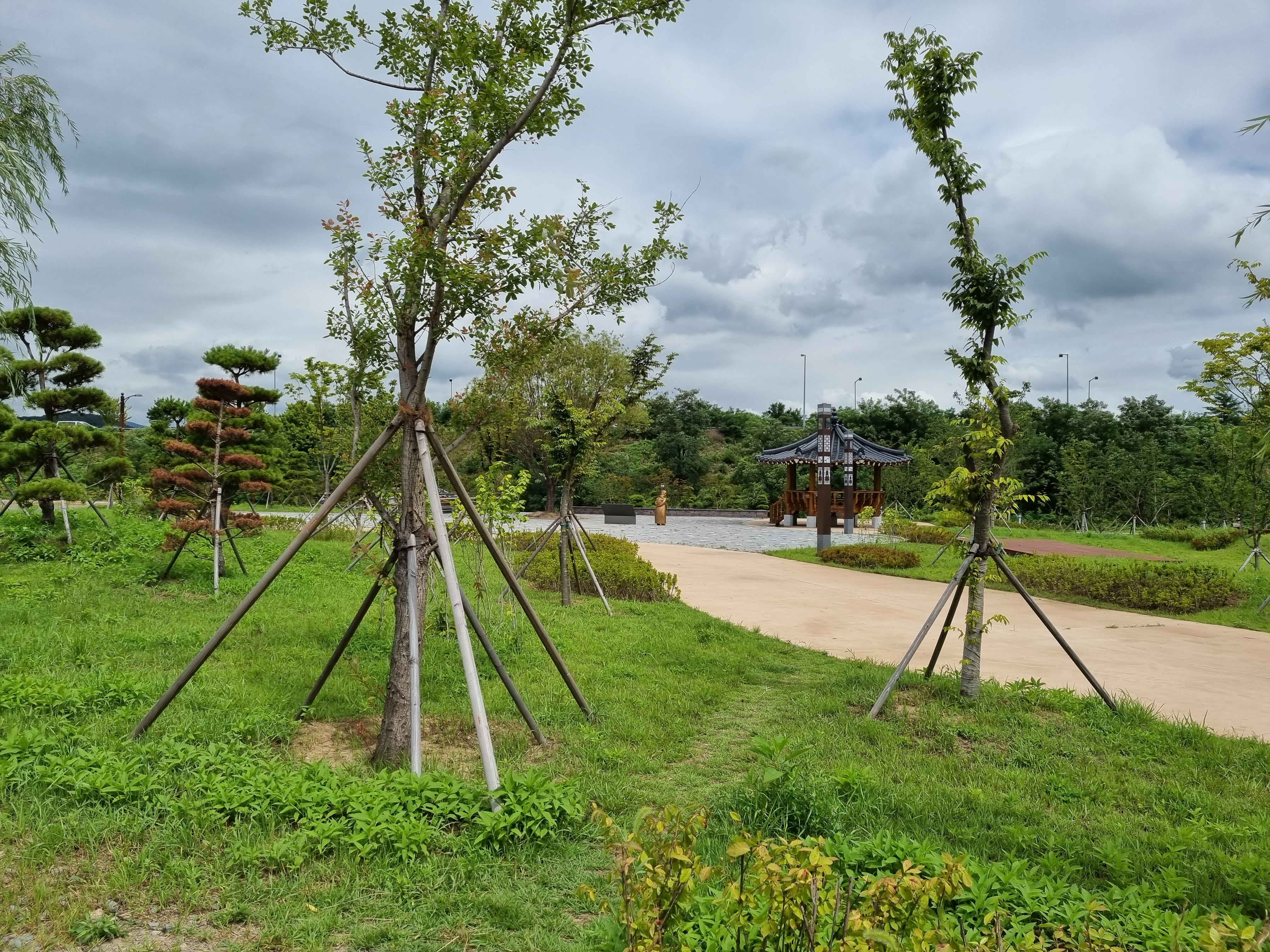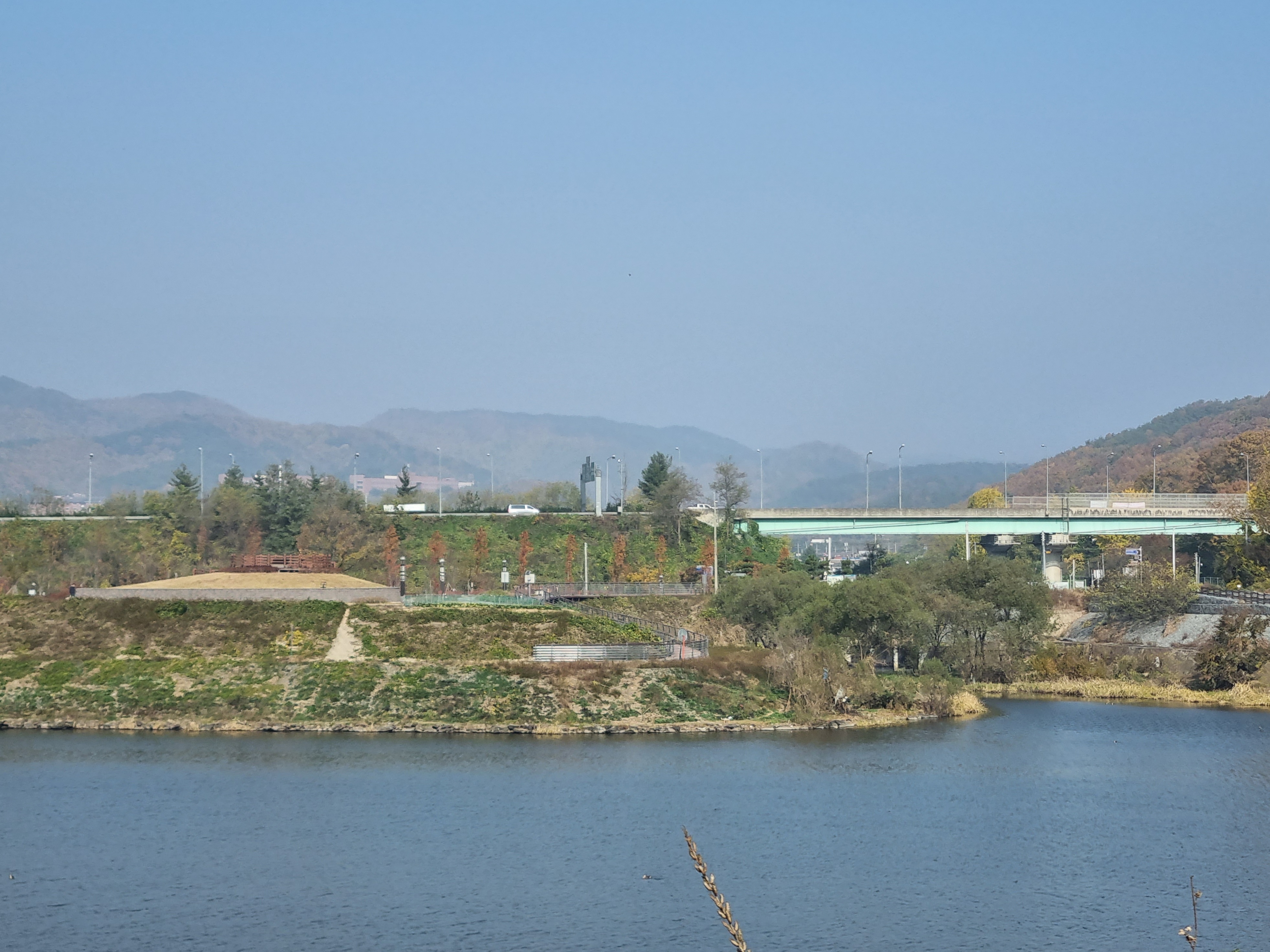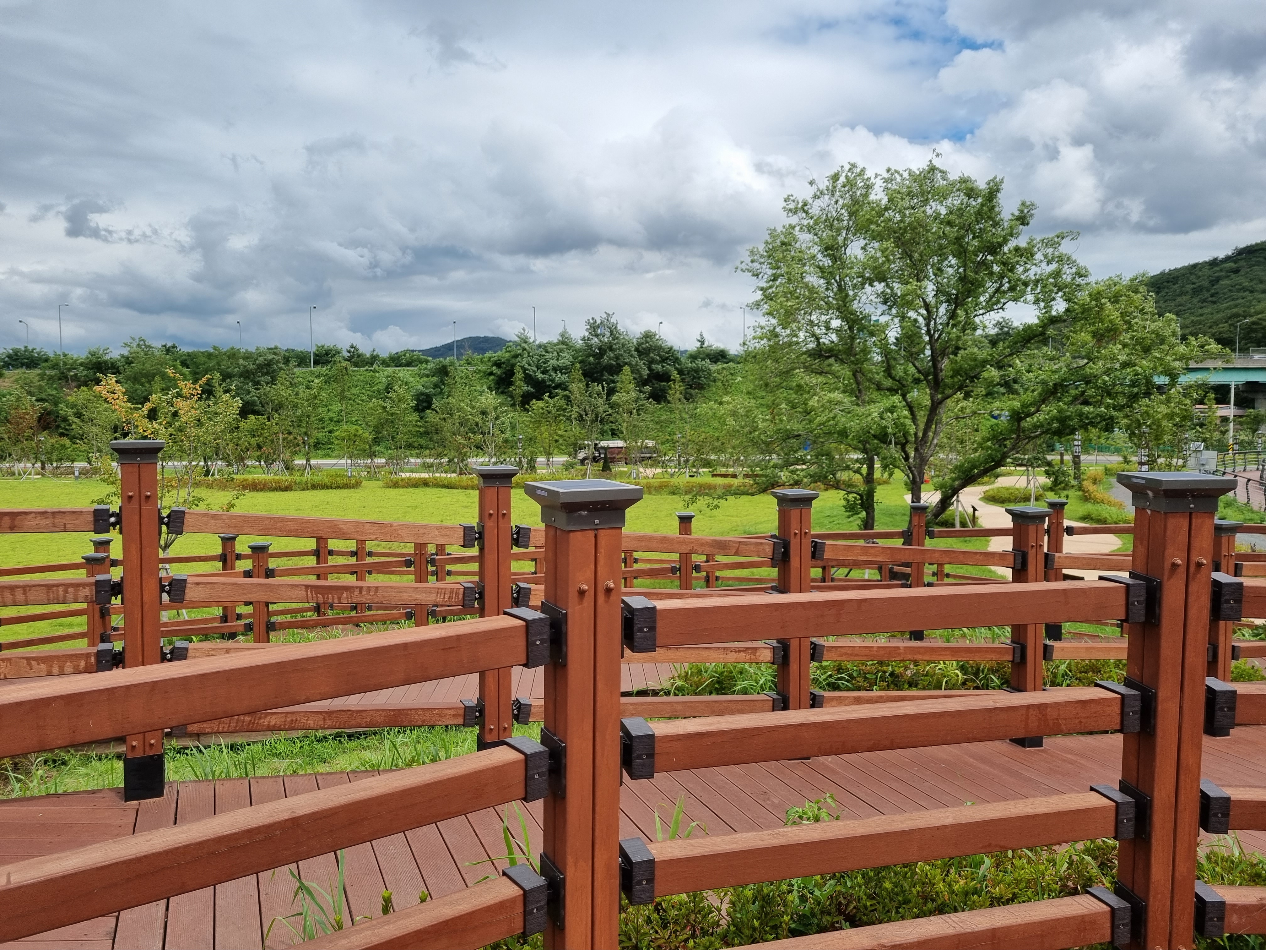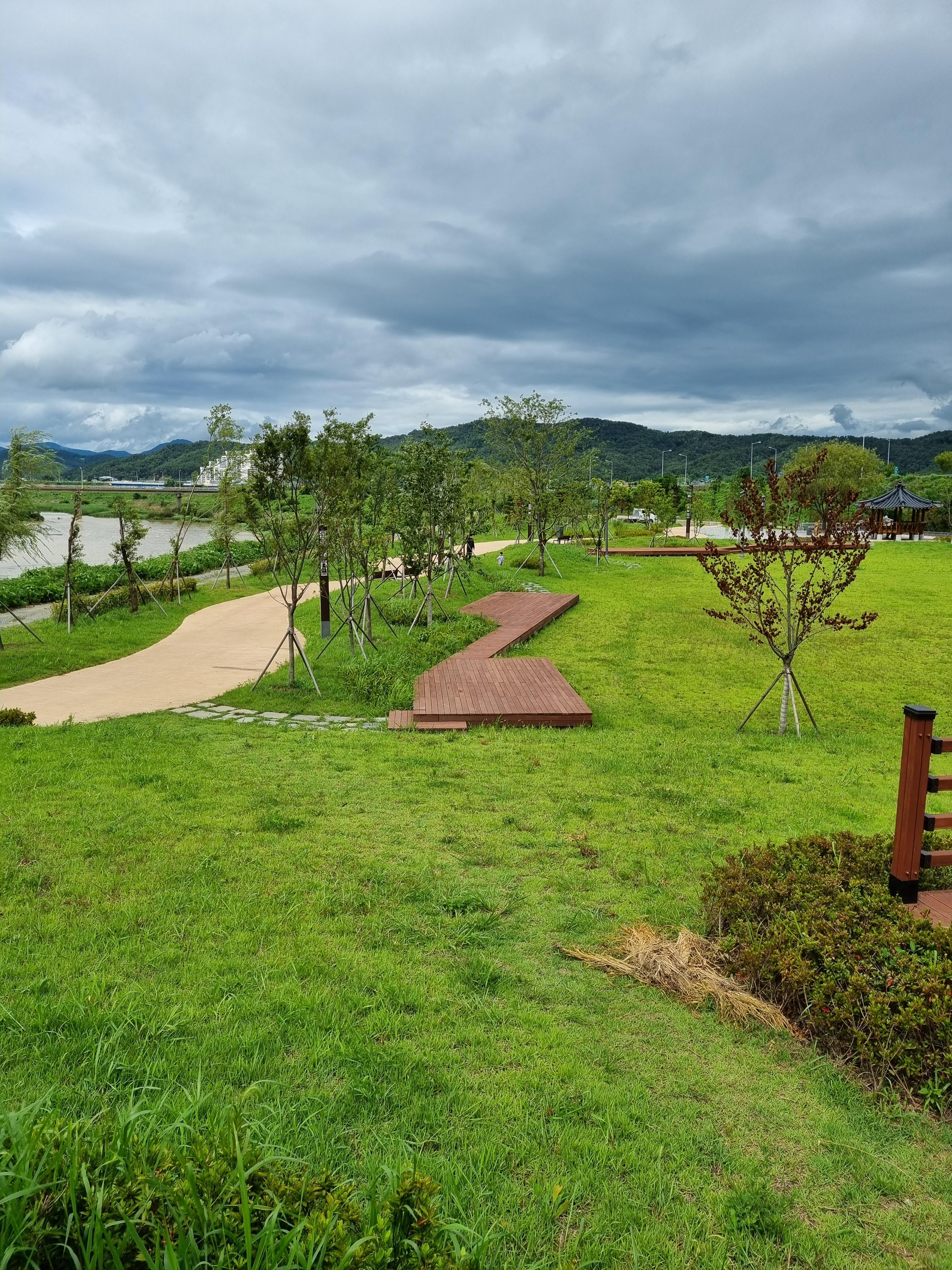 정자 하나 있고, 데크길을 따라 형산강을 조망하실 수 있습니다. 넓은 잔디밭이 있어 아이와 자유롭게 비눗방울 놀이나 자연탐색을 하기에도 좋아요.