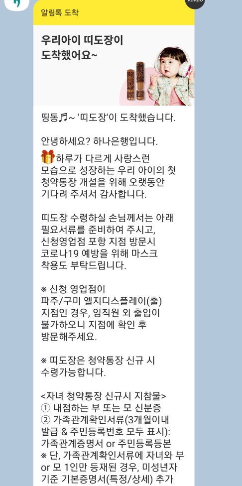 월급 없는 육아맘이라 생활비도 빡빡한데 저금할 여윳돈은 생각도 못했던지라 아기 통장 개설은 미루던 일이었는데...