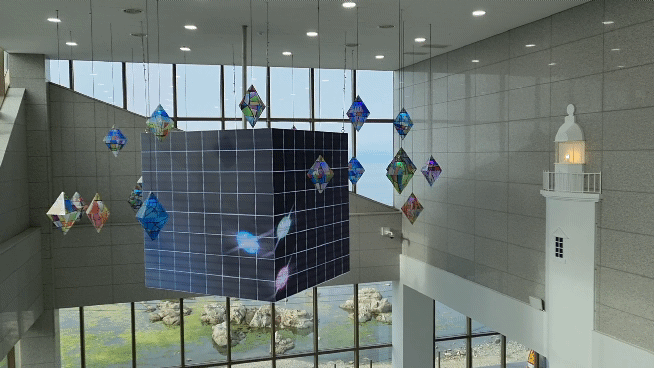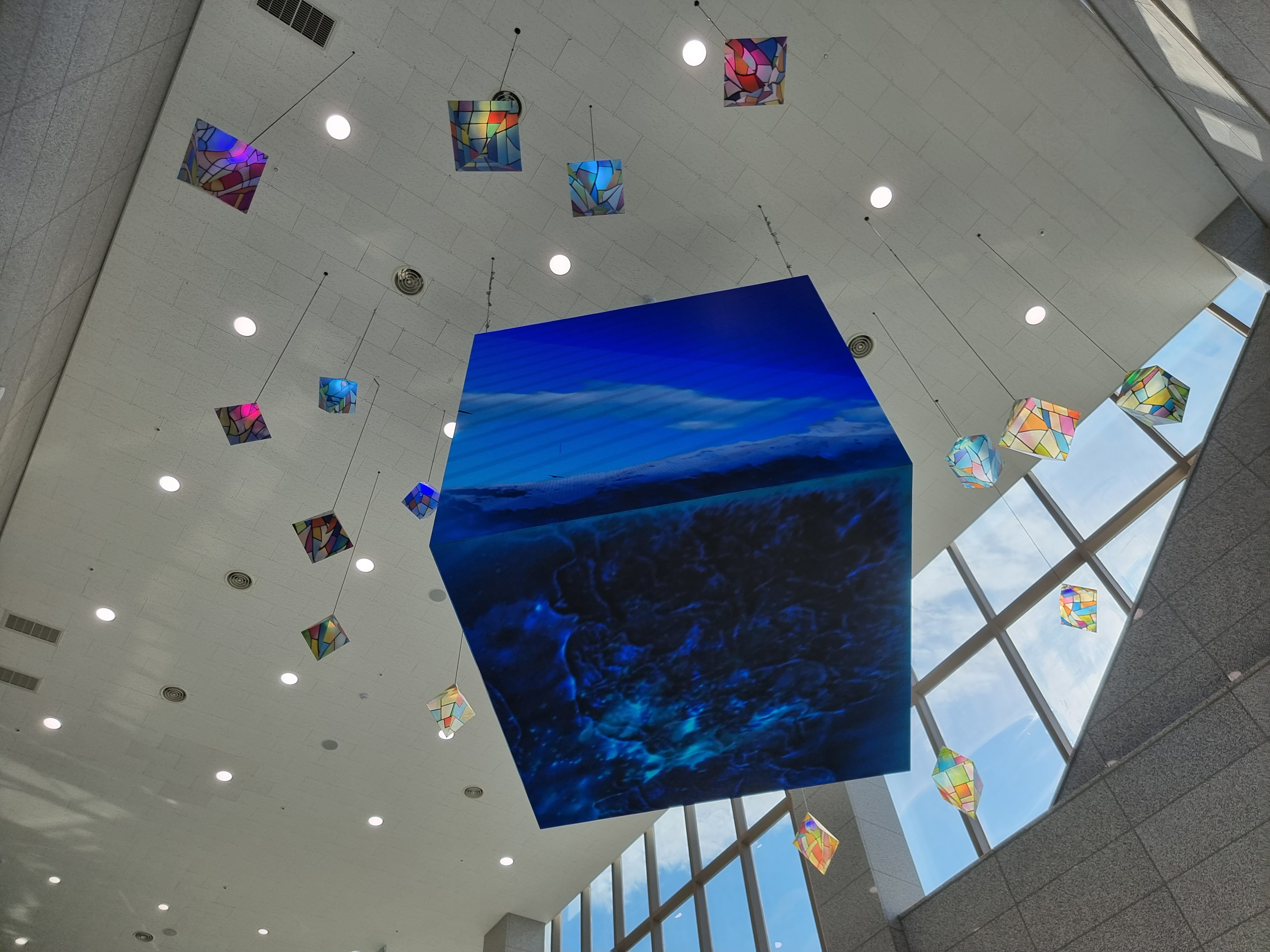 고개를 들면 보이는 천장에 달린 미디어아트.