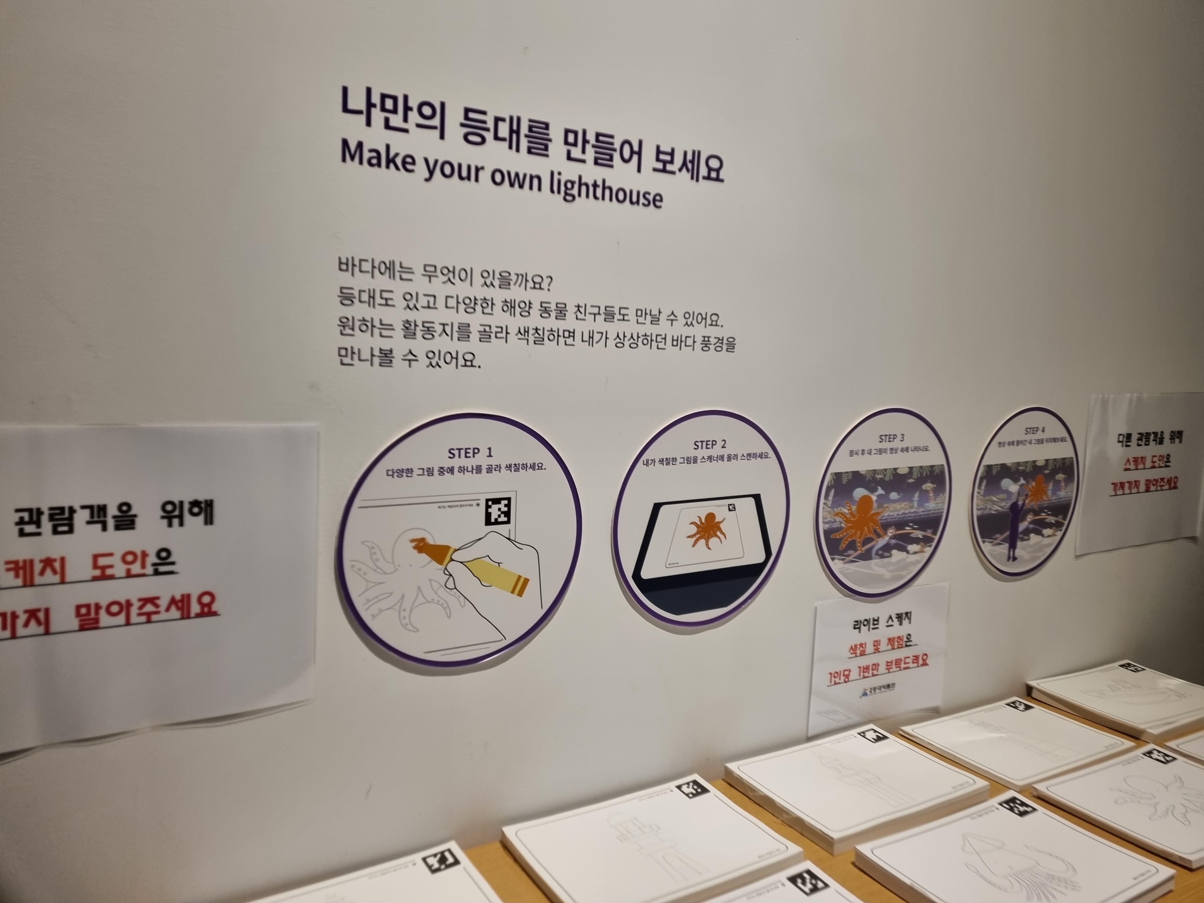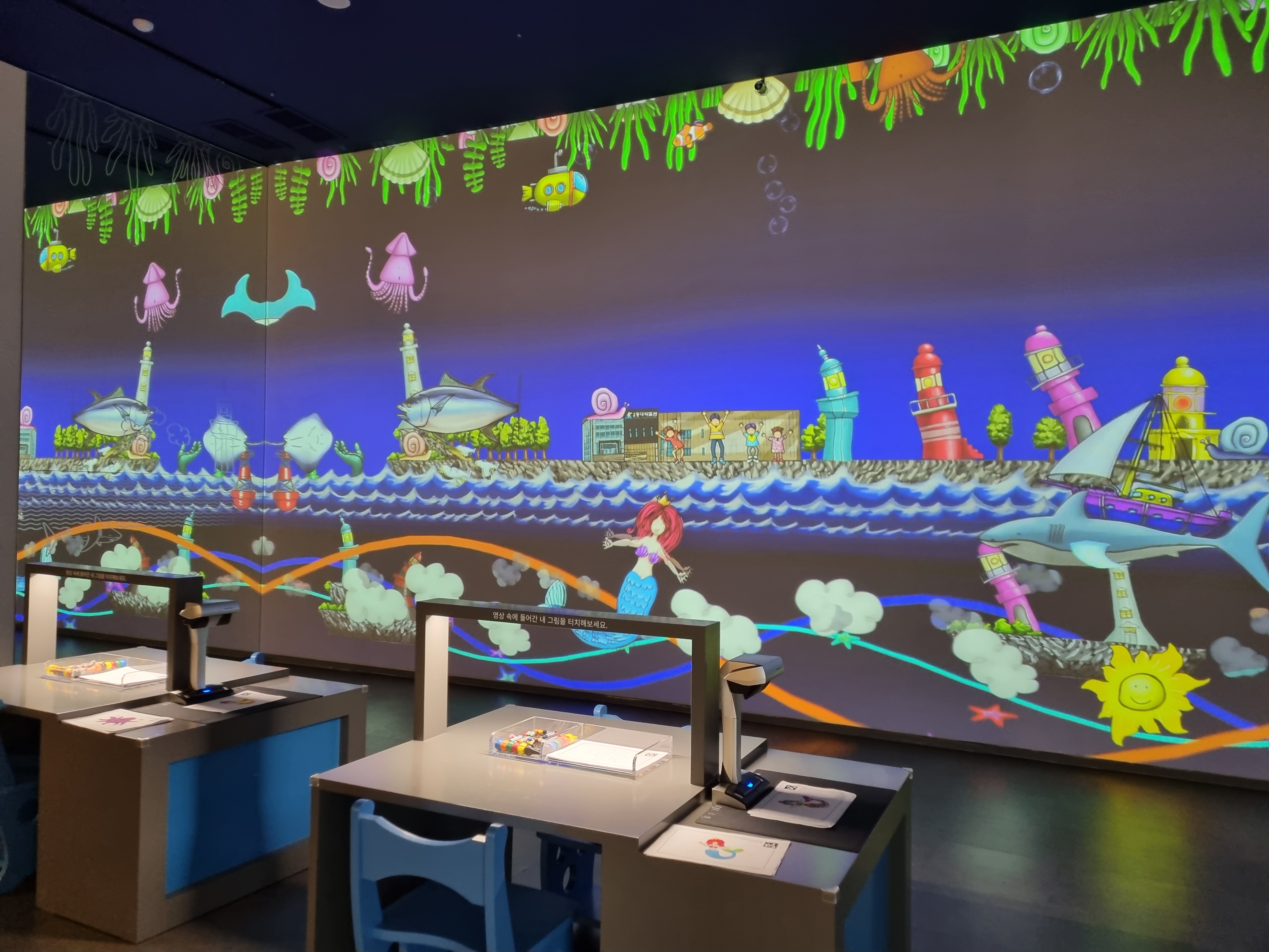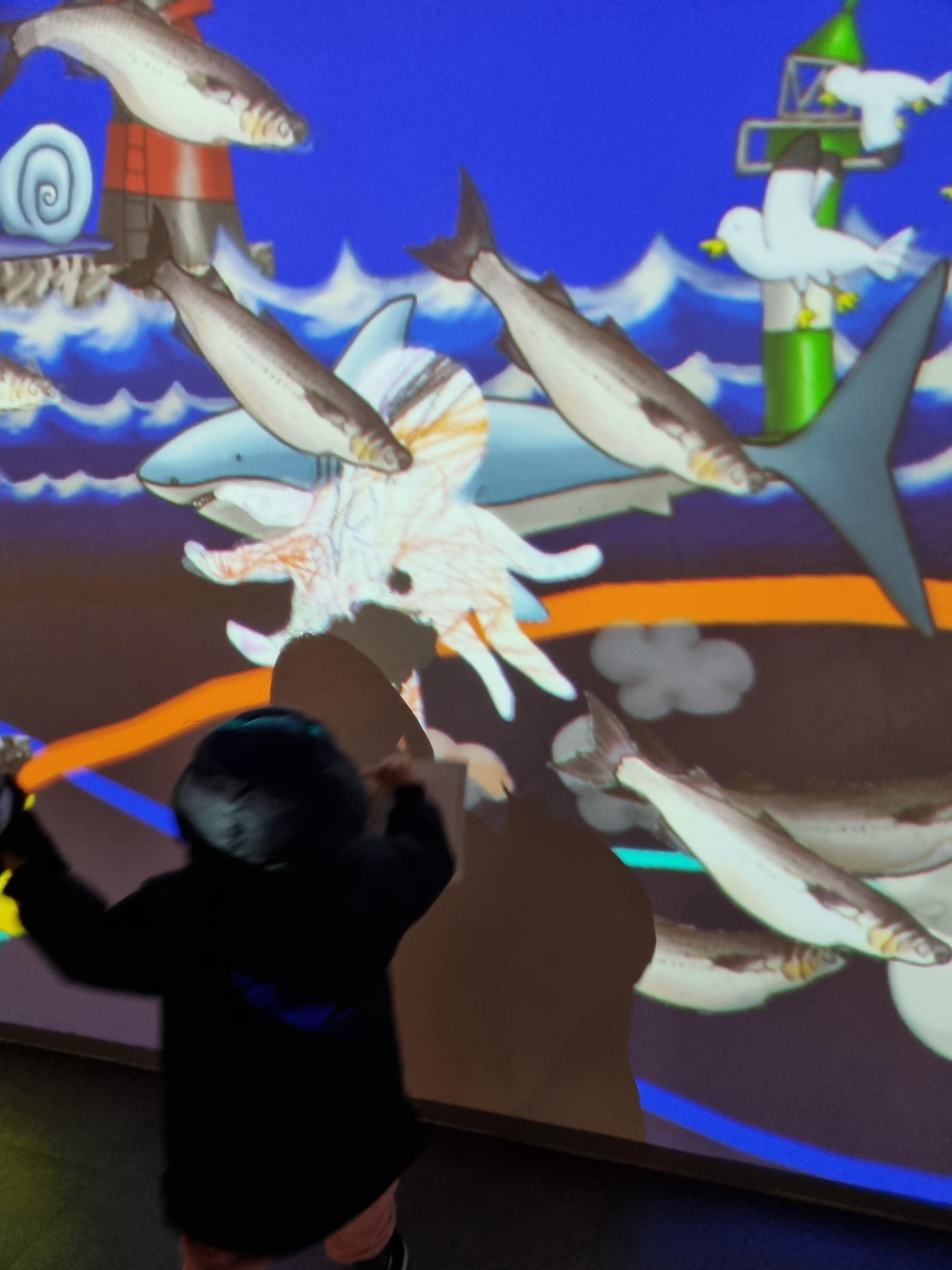 바닥의 조개나 벽면의 물고기를 건드리면 띠용! 띠용! 소리가 났어요. 신나서 쫓아다니며 구경하고 눌러보고 하네요~! 꽤나 좋아해서, 앞으로 갔다가 이 전시를 다시 보러 되돌아왔었습니다. 이 장면말고도 시간이 지나니 배를 띄운 장면, 낮의 바다 등 장면이 바뀌었습니다.