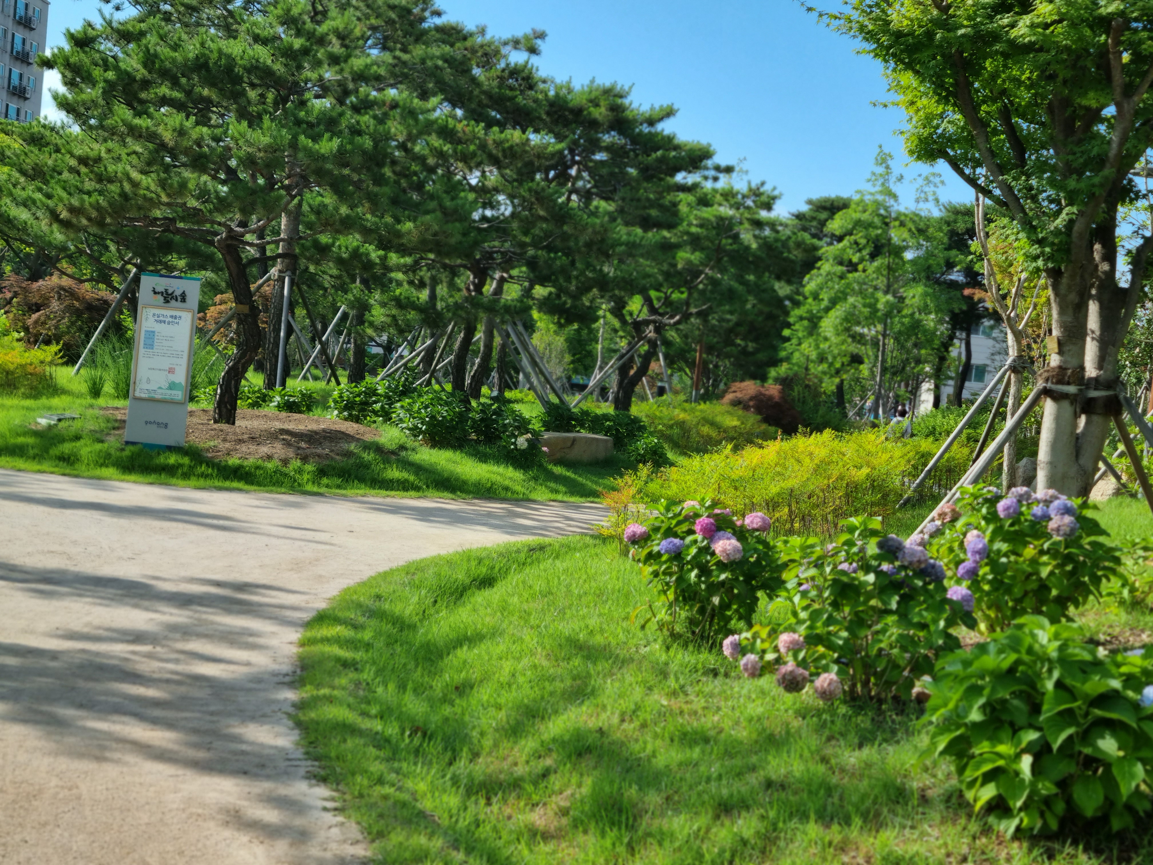 여름에도 예쁜. 수국꽃이 심겼다! 철길숲에도 심기고, 여기저기 포항 심기는 모습. 가까운 발치에 심겨서 아이 손에 잘 닿음. 덥지만 그래도 아직은 그늘에 들어가면 선선한 날씨.