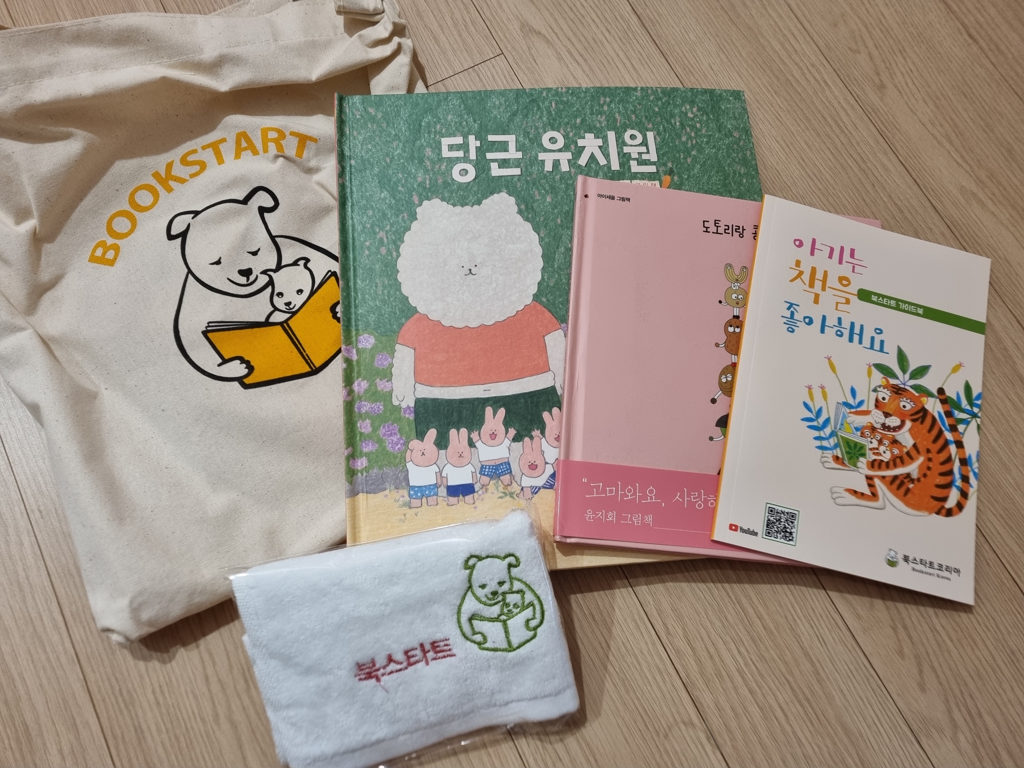 : 에코백, 북스타트사업 소개 책자 1부, 극세사재질 미니 타올 1장, 그림책 2권