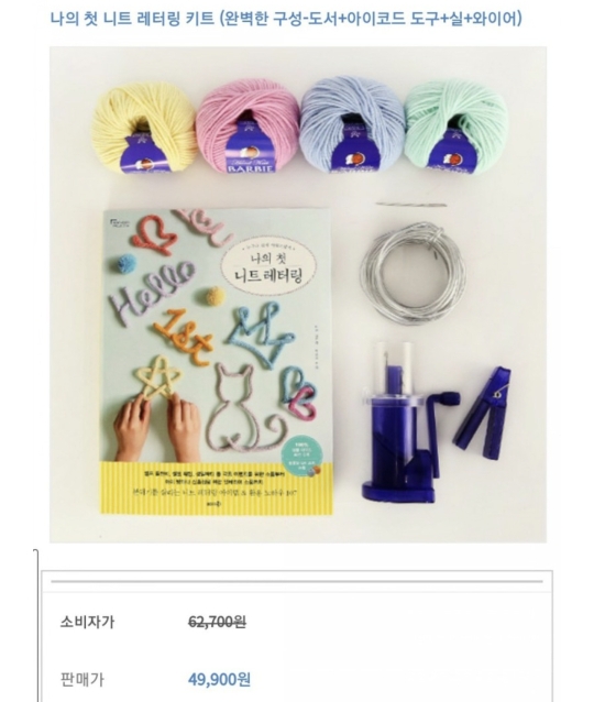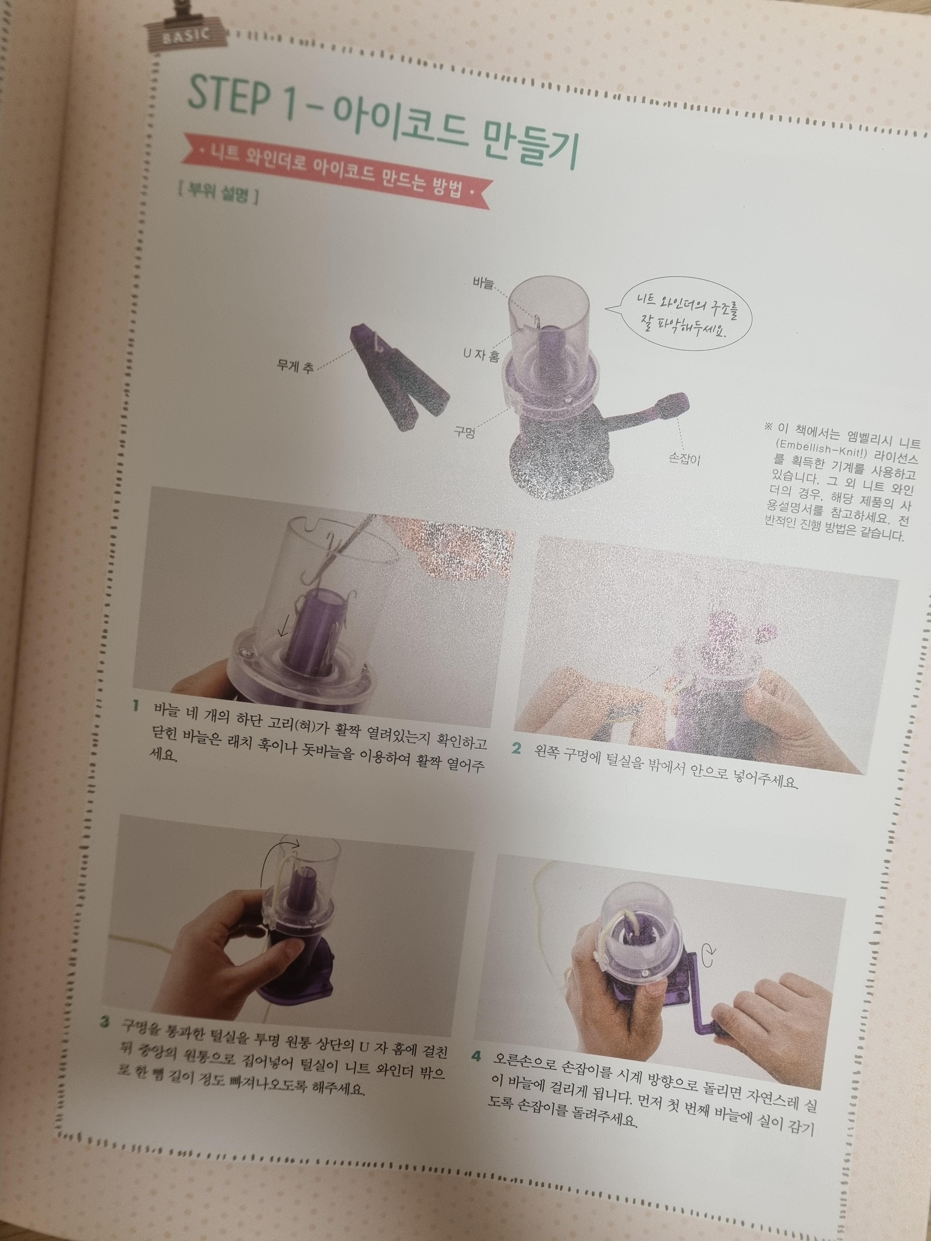 diy키트로 구매하였는데 구성은 - 책, 니트 와인더, 무게추, 돗바늘, 털실 4묶음(파스텔 색상), 알루미늄와이어(2mm) 이었습니다.