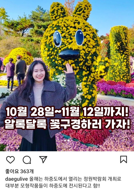 정원박람회 일정 : 2024.10.11금 - 10. 15화 http://www.daegugardenshow.co.kr/ 2024 대구정원박람회2024 대구정원박람회 소개 정원전시 정원산업전 행사프로그램 자료실www.daegugardenshow.co.kr 댑싸리 위치는 황화