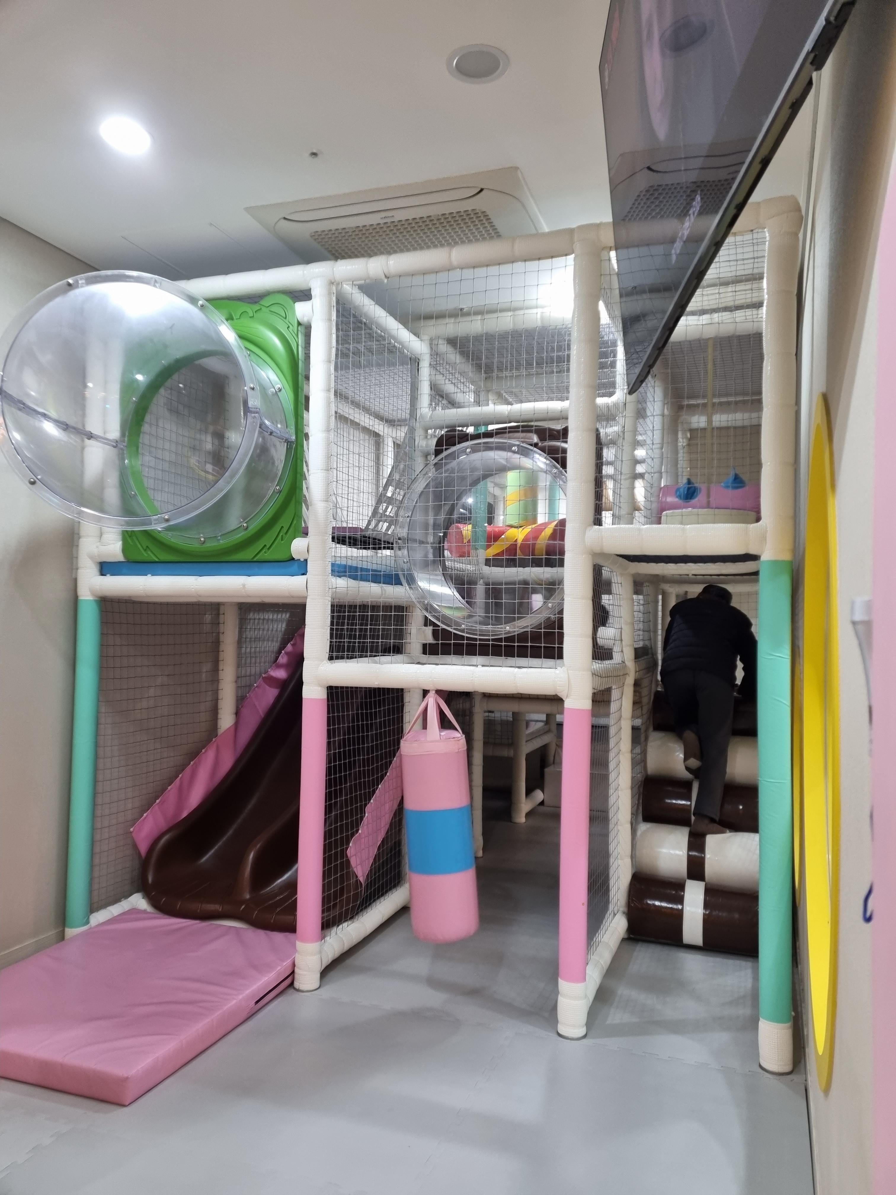 ▪️아이들이 놀이방에서 노는 동안, 어른들이 대기+지켜보며 볼 수 있는 tv 화면도 있습니다.