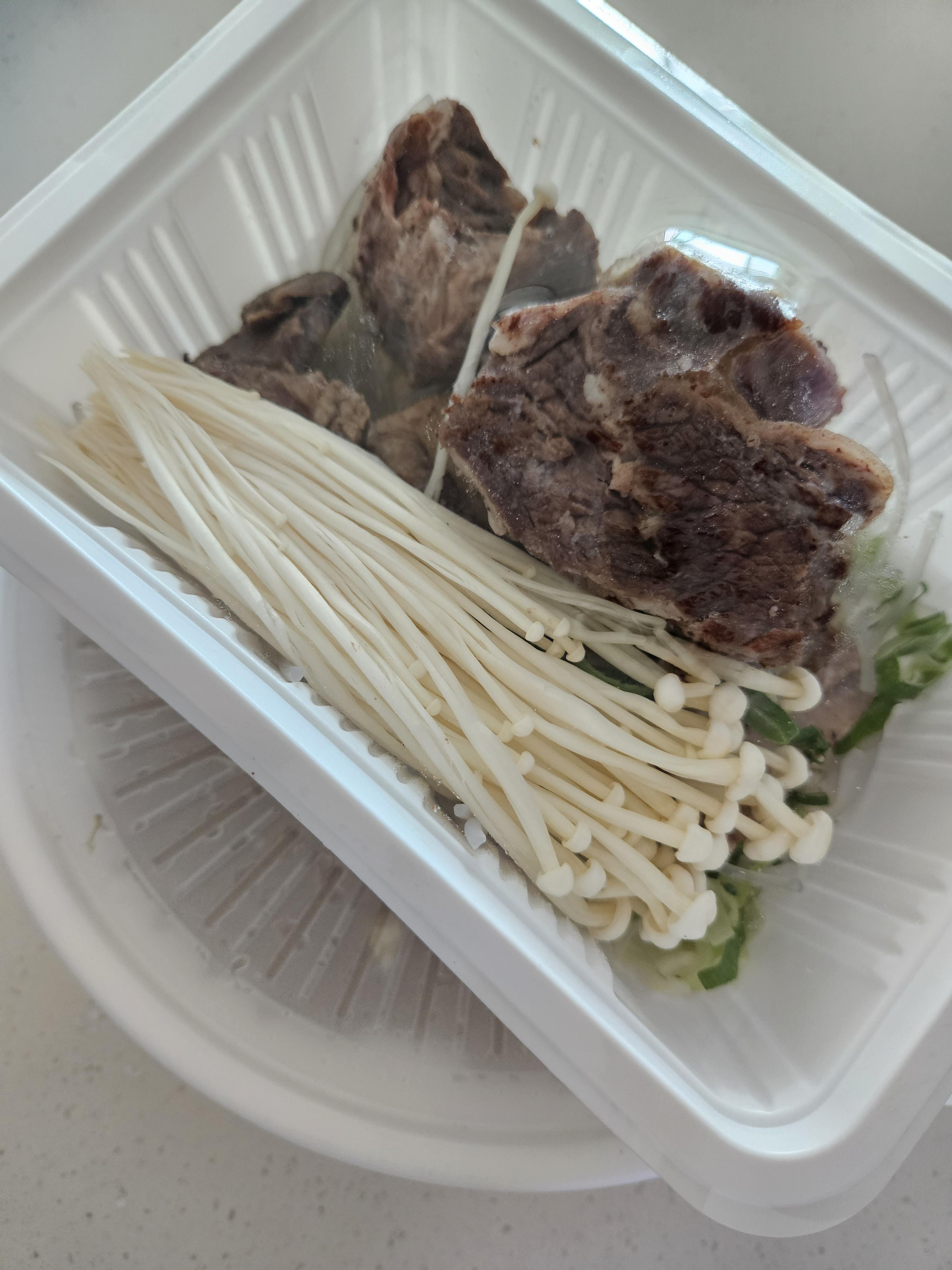 고기랑 팽이버섯, 잡채면, 파 등이 건더기예요!