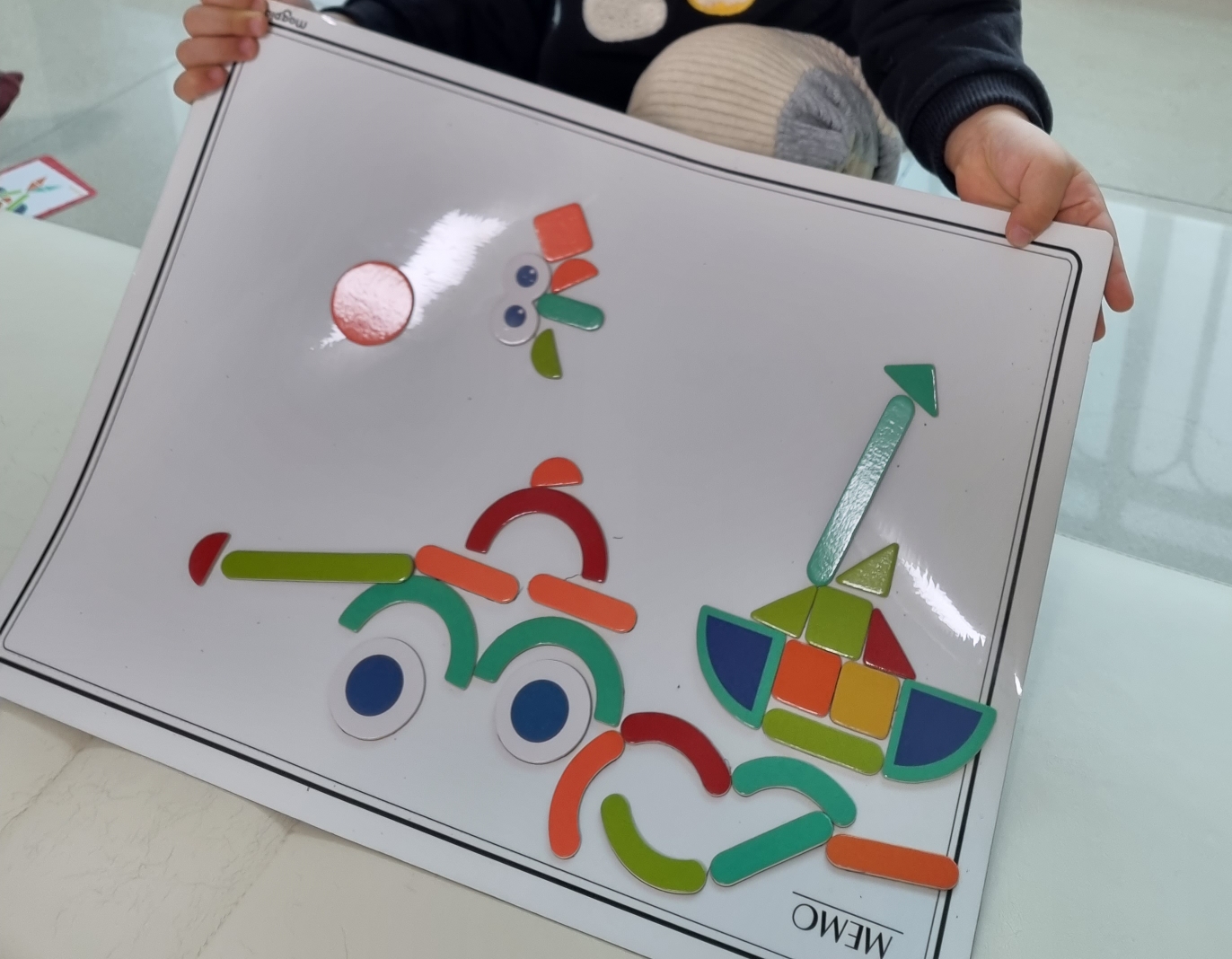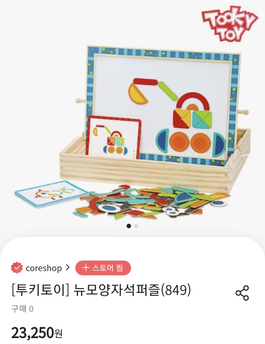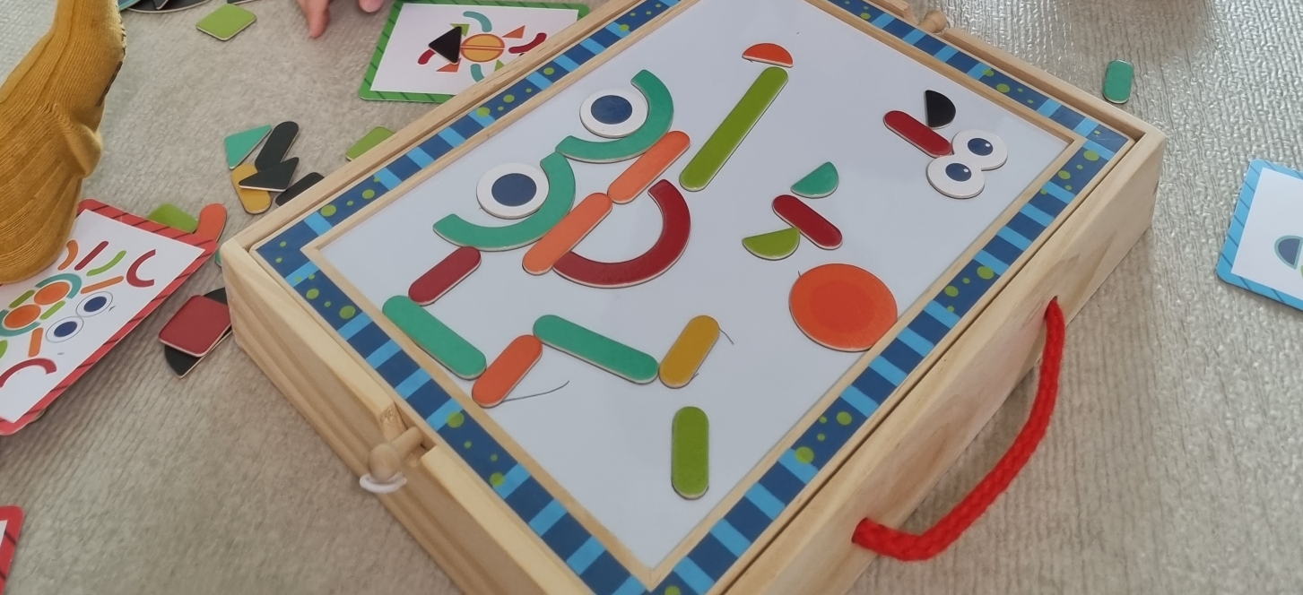 퍼즐- 색색깔의 기본 도형 형태 + 눈 모양이라던지 아이가 만들기 좋아하는 요소 형태가 있음. 미션지- 아이가 만들고 싶어하는 형태의 미션지(양면 그림카드, 30개의 미션)가 있음. 퍼즐조각 보관함 제공.