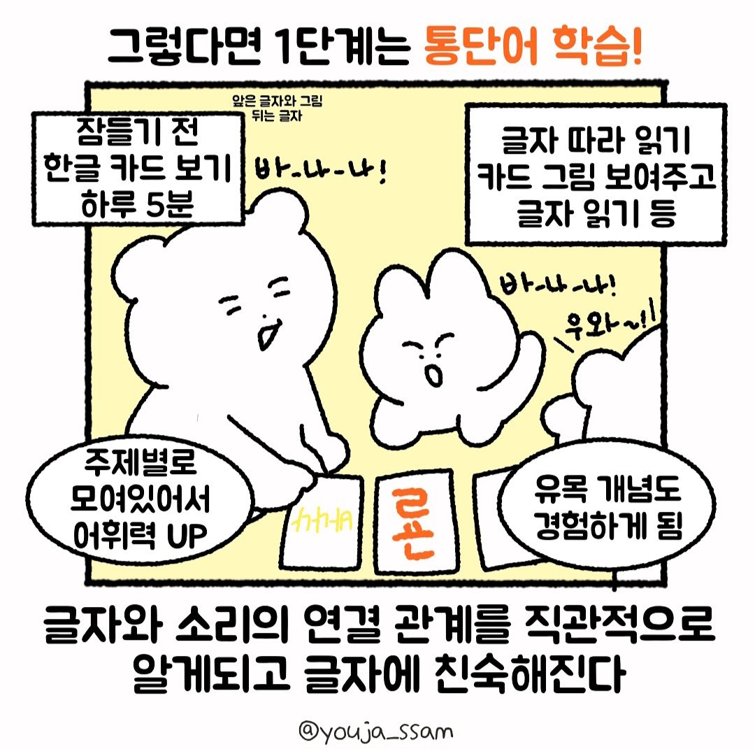 아이들이 글자를 깨치는 과정을 보면 먼저 단어를 깨칩니다. 그리고 단어들을 이어 문장을 읽습니다.