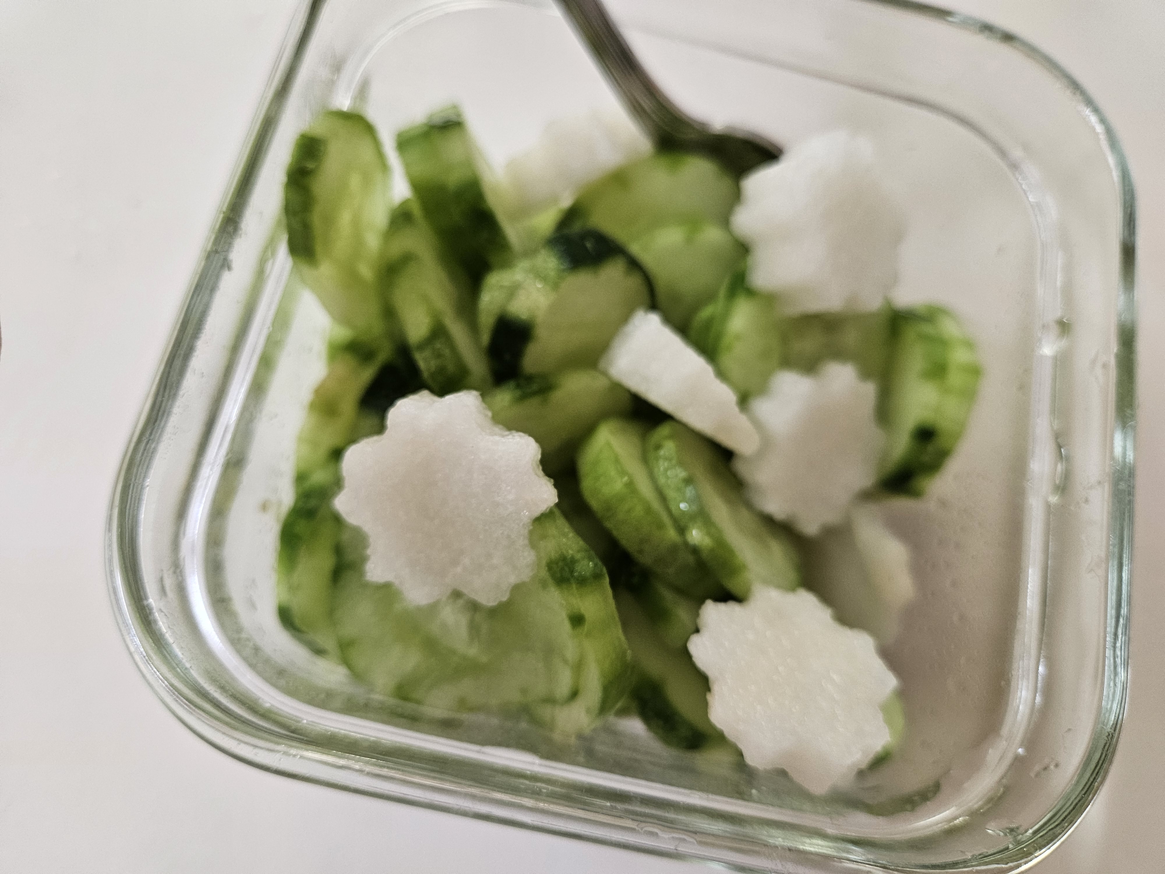 오이는 썰어낸 단면이 쿠키틀 크기와 비슷해서 제가 썰어서 소금에 절여두고, 참기름도 미리 넣어두었어요. 깜빡하고 참깨를 빠트렸네요😅