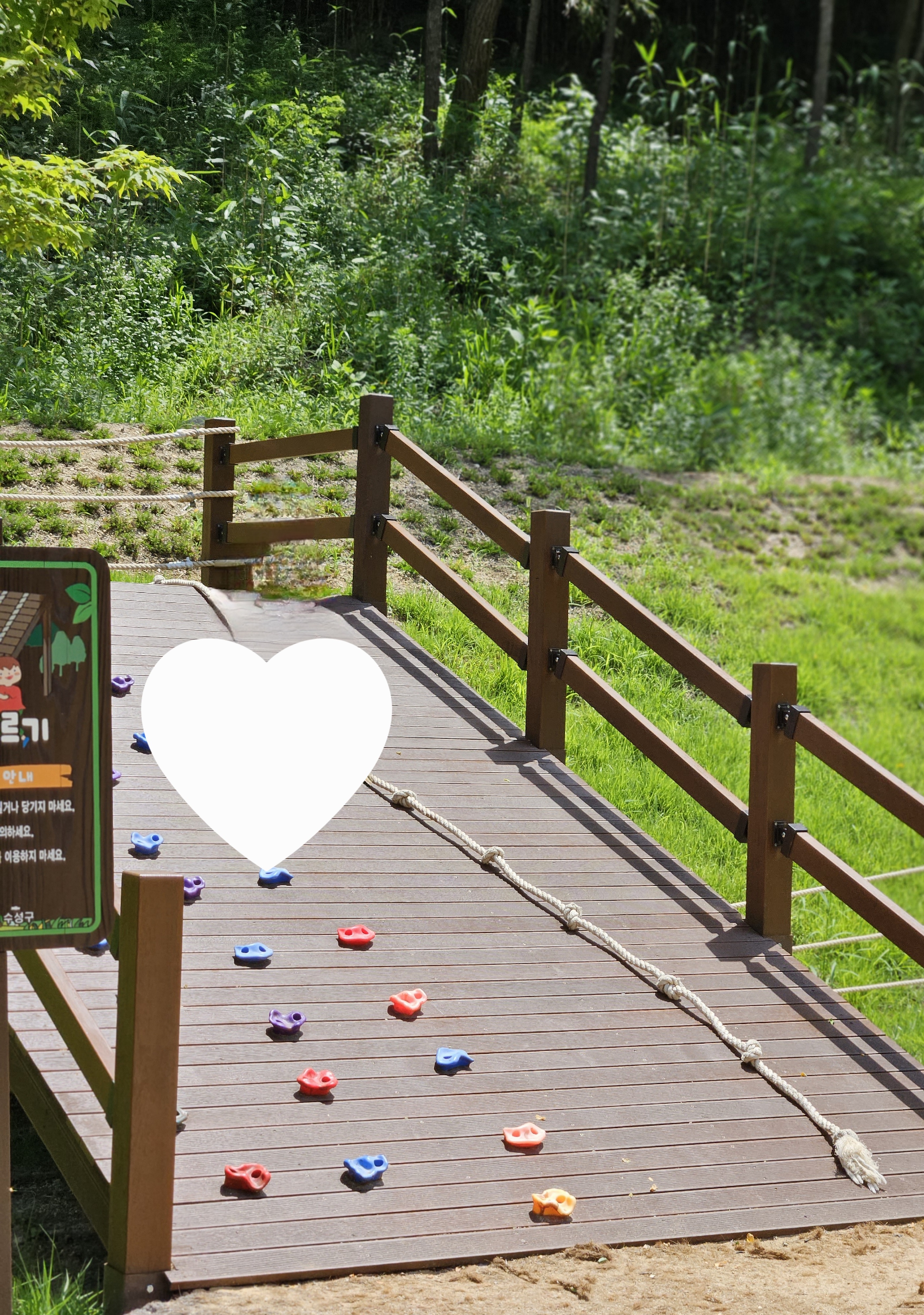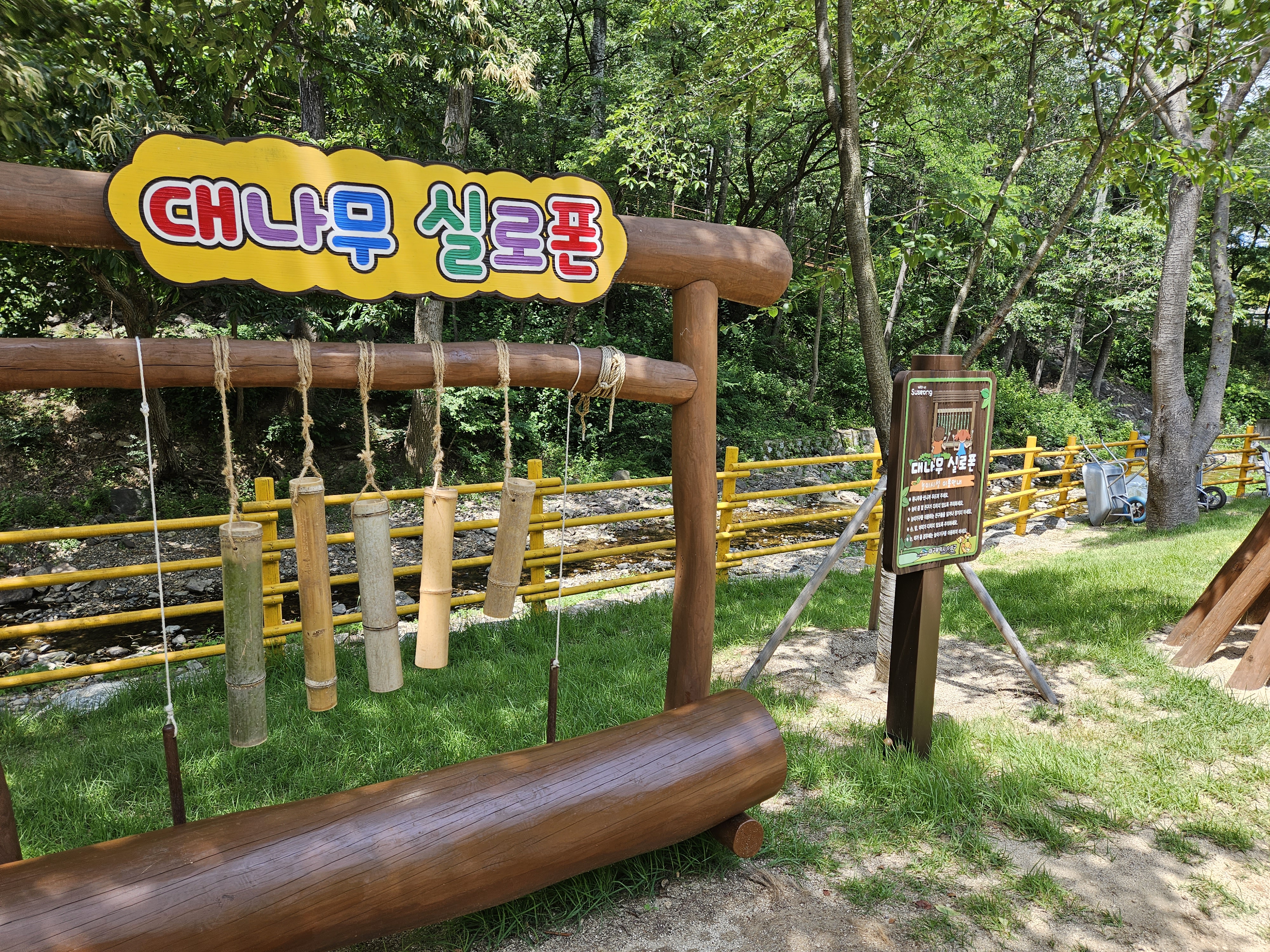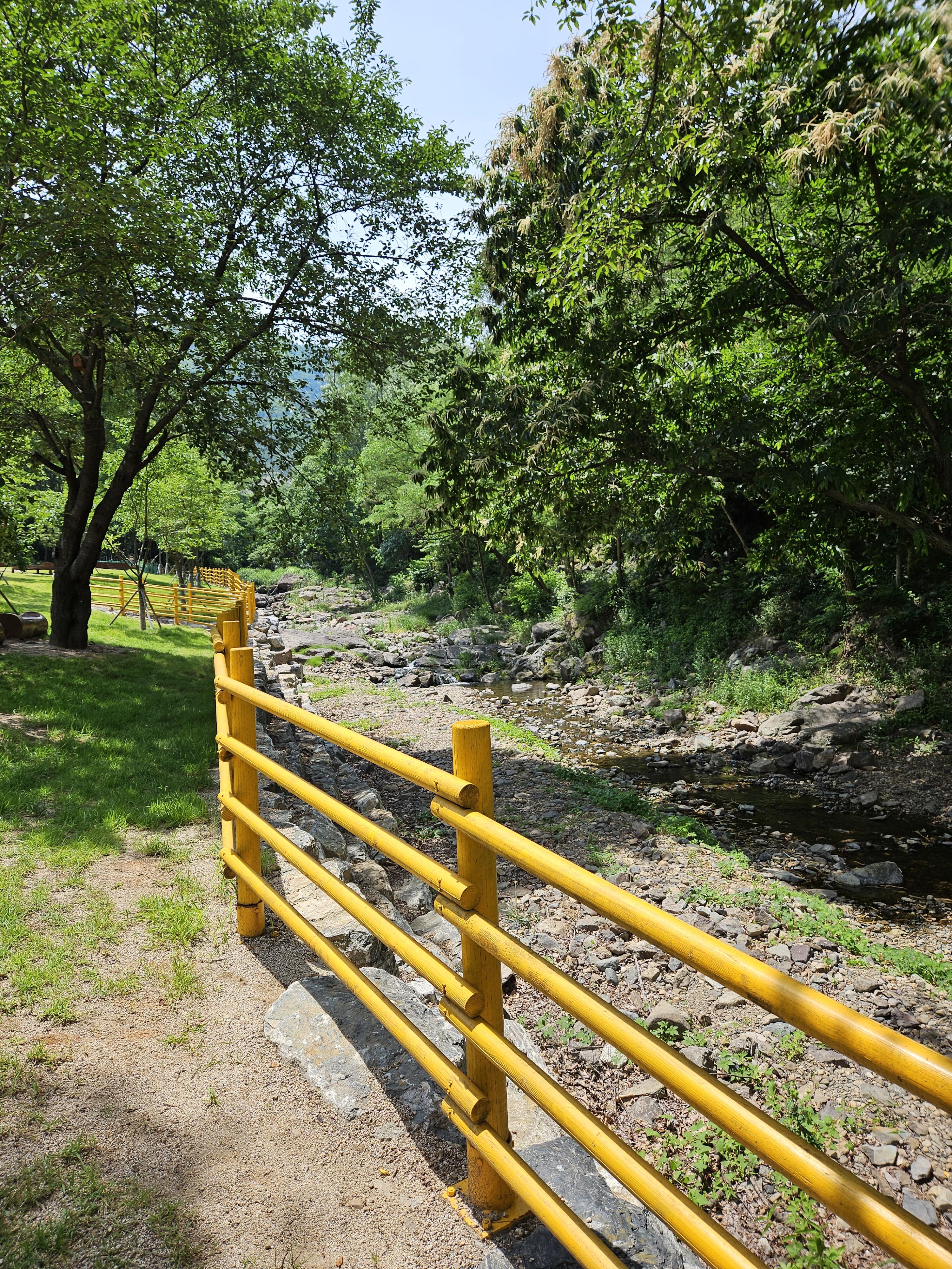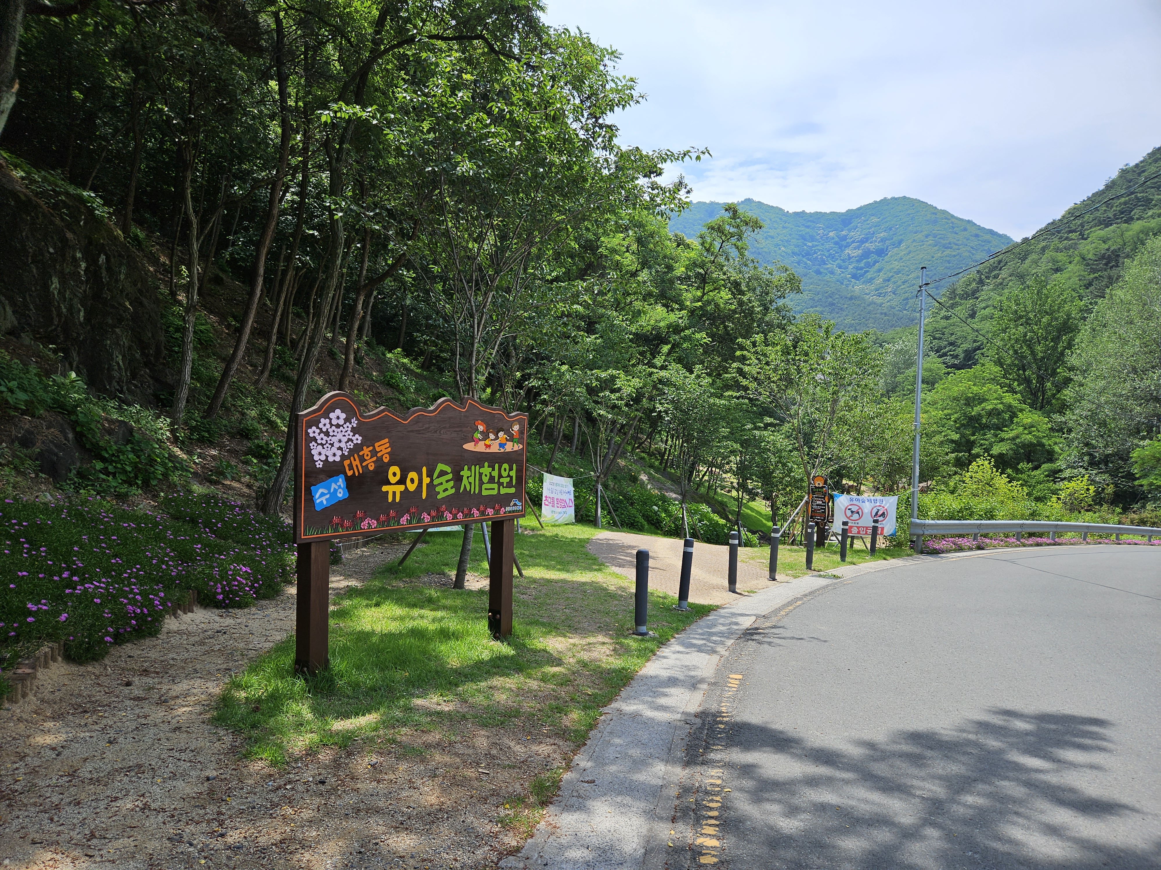양 옆의 숲과 산을 따라 조성된 유아숲체험장소가 나와요! 이 풍경을 보며 입장하실게요!