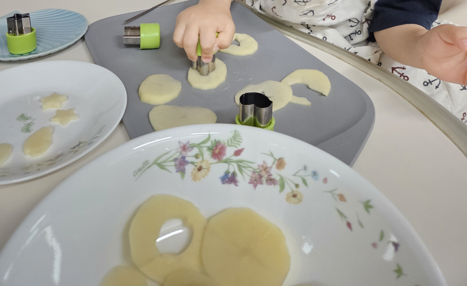 그럼 아이의 할 몫은 쿠키틀로 감자를 예쁜 모양으로 찍어주기.