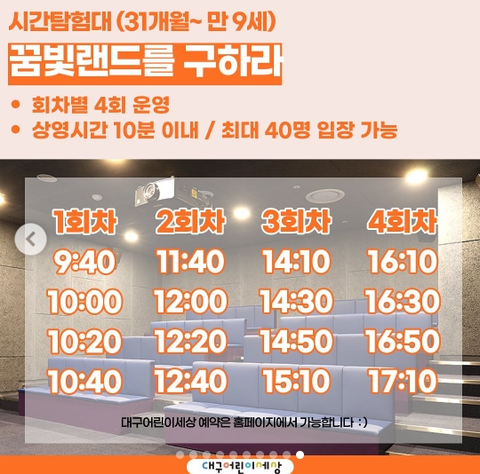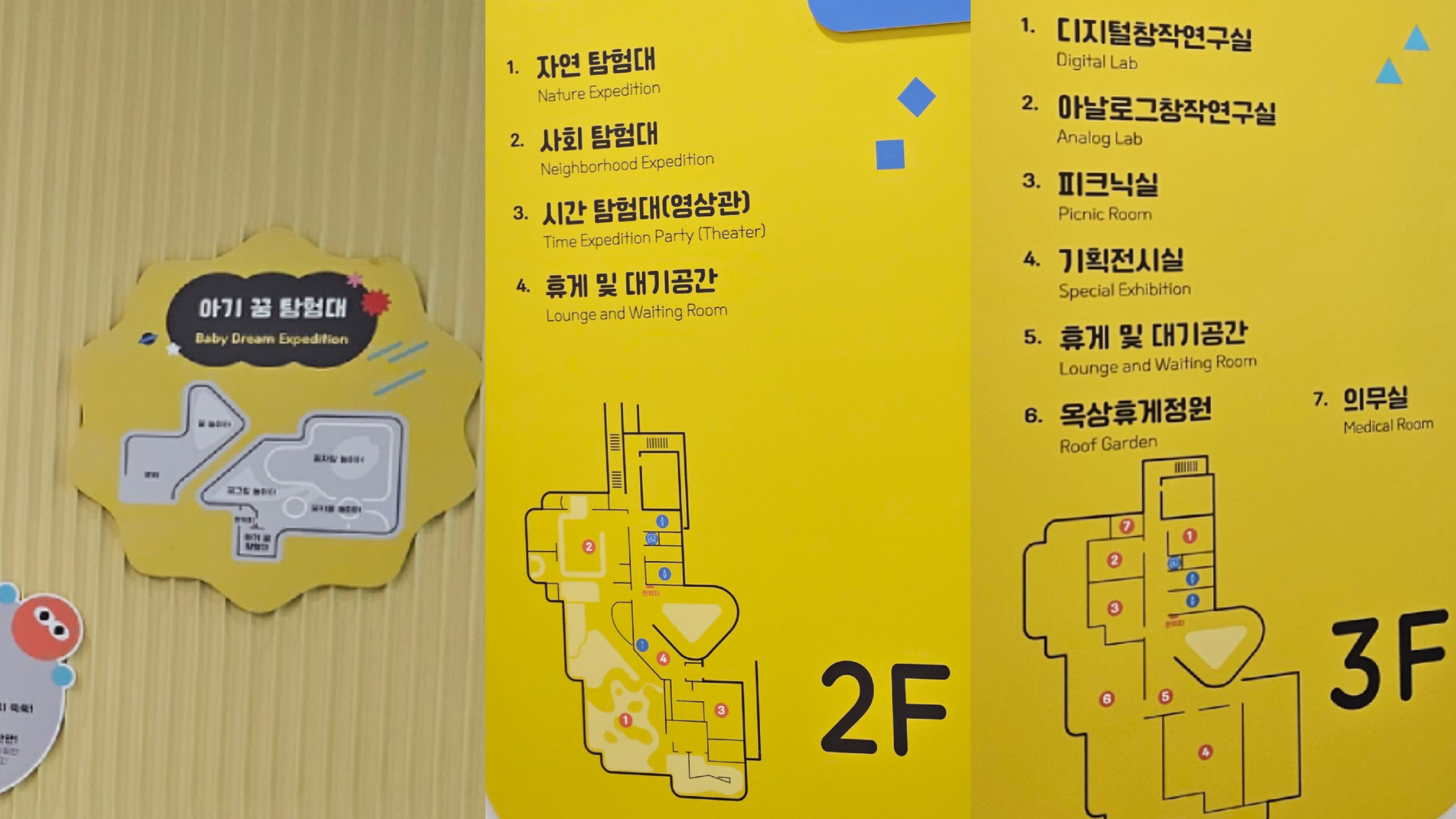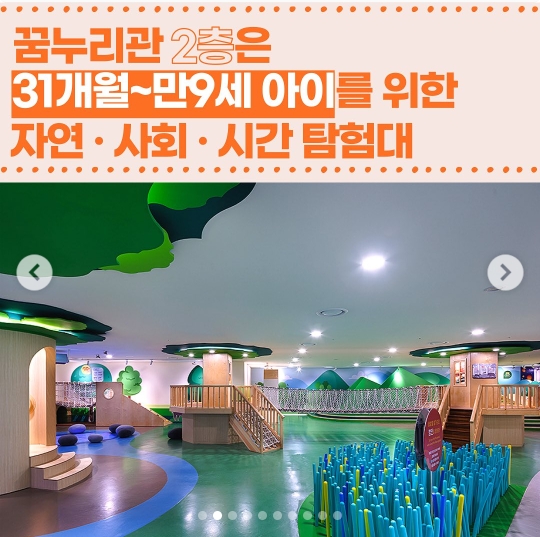 4가지 영역의 테마 체험존(아기꿈 탐험대, 자연 탐험대, 사회 탐험대, 시간 탐험대)에서 보고 듣고 느끼고 만지는 활동을 통해 오감을 활용한 다양한 체험활동을 제공한다고 합니다.