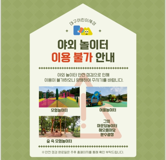 현재, 안점점검 미실시로 이용 불가능한 실내 시설 및 야외놀이터.