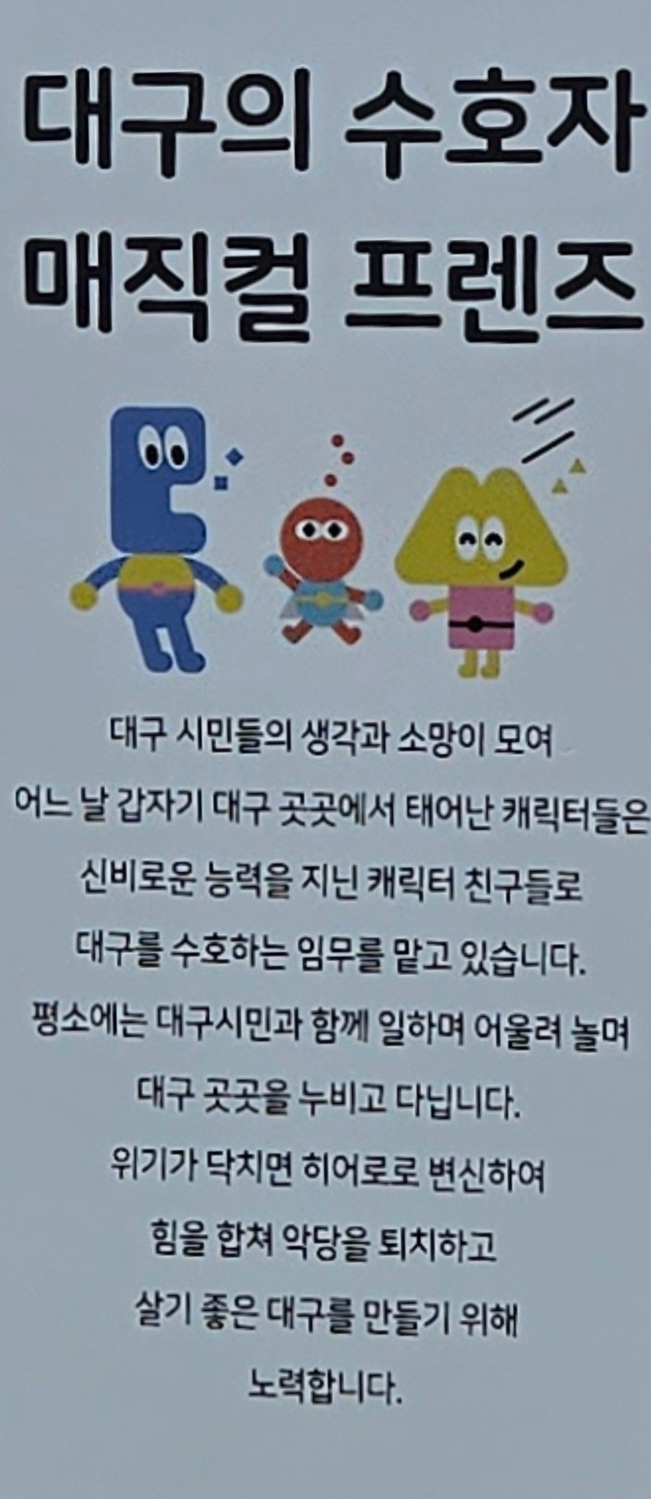 대구를 수호하는 히어로들로, 평소에는 대구시민과 어울려 놀고 위기가 닥치면 히어로가 되어 악당을 퇴치하고 살기 좋은 대구를 만들기위해 애쓴다고 합니당! 🦸♂️ 🦸♀️ 그저 귀여운 캐릭터네, 였는데 이런 재미난 스토리도 숨어있었네요!