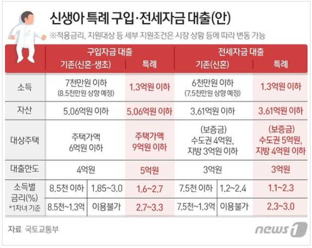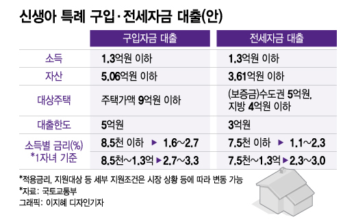 신생아 특례 구입자금·전세자금 대출을 도입해 1%대 저금리로 주택 구입·전세 대출도 지원한다. 소득 기준도 신혼가구 7000만원 이하에서 1억3000만원 이하로 대폭 올린다.