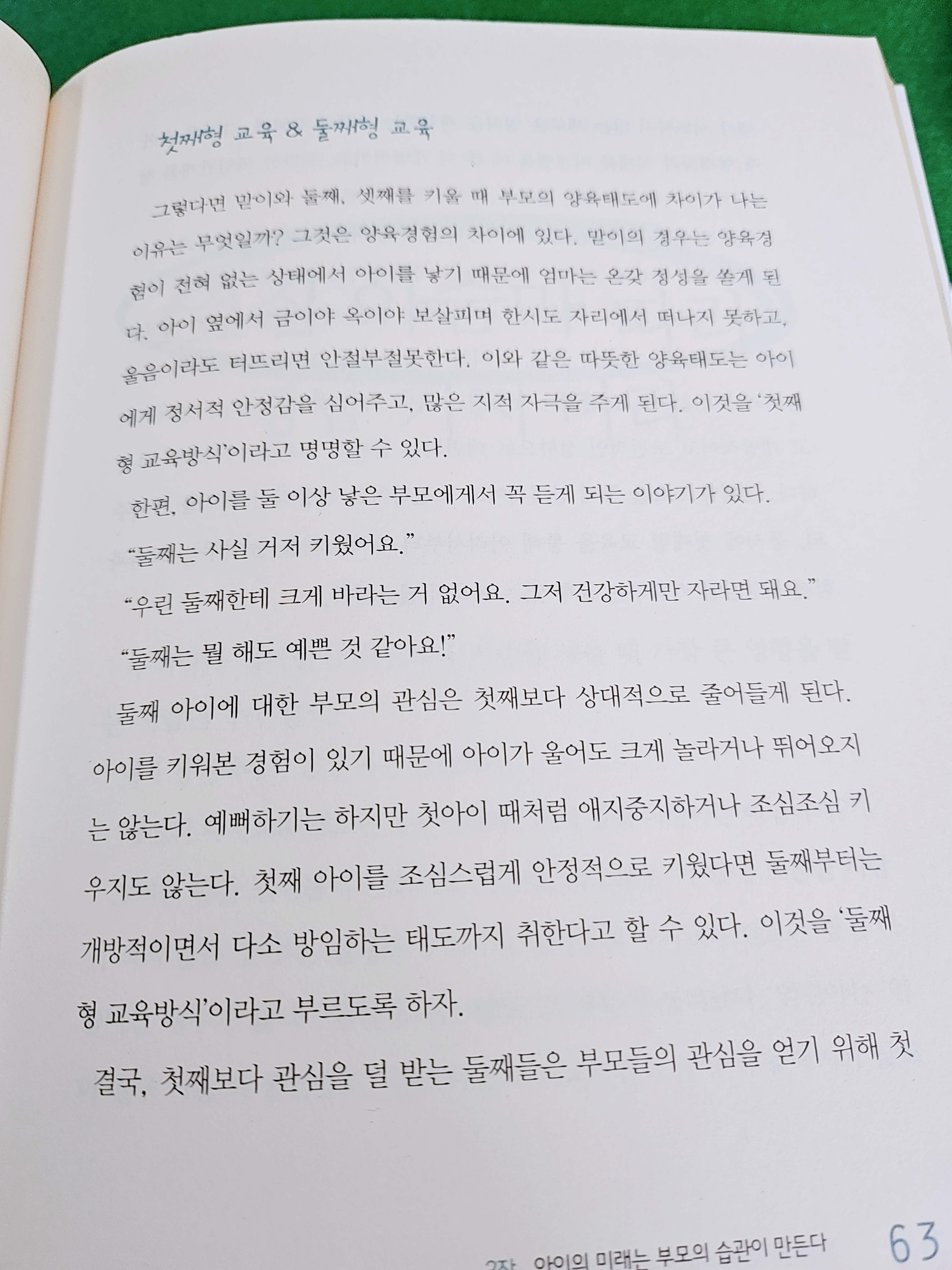 첫째형 교육방식: 첫째의 경우는 양육경험잉 전혀 없는 상태에서 아이를 낳기 때문에 엄마는 온갖 정성을 쏟게 된다. 아이 옆에서 금이야 옥이야 보살피며 한시도 자리에서 떠나지 못하고, 울음이라도 터뜨리면 안절부절못한다. 이와 같은 다뜻한 양육태도는 아이에게 정서적 안정감을 심어주고, 많은 지적 자극을 주게 된다. 지적수준이 높은 성인들과 상호작용하며 풍부한 자극 받게 되어 언어나 지적능력 빨리 발달.