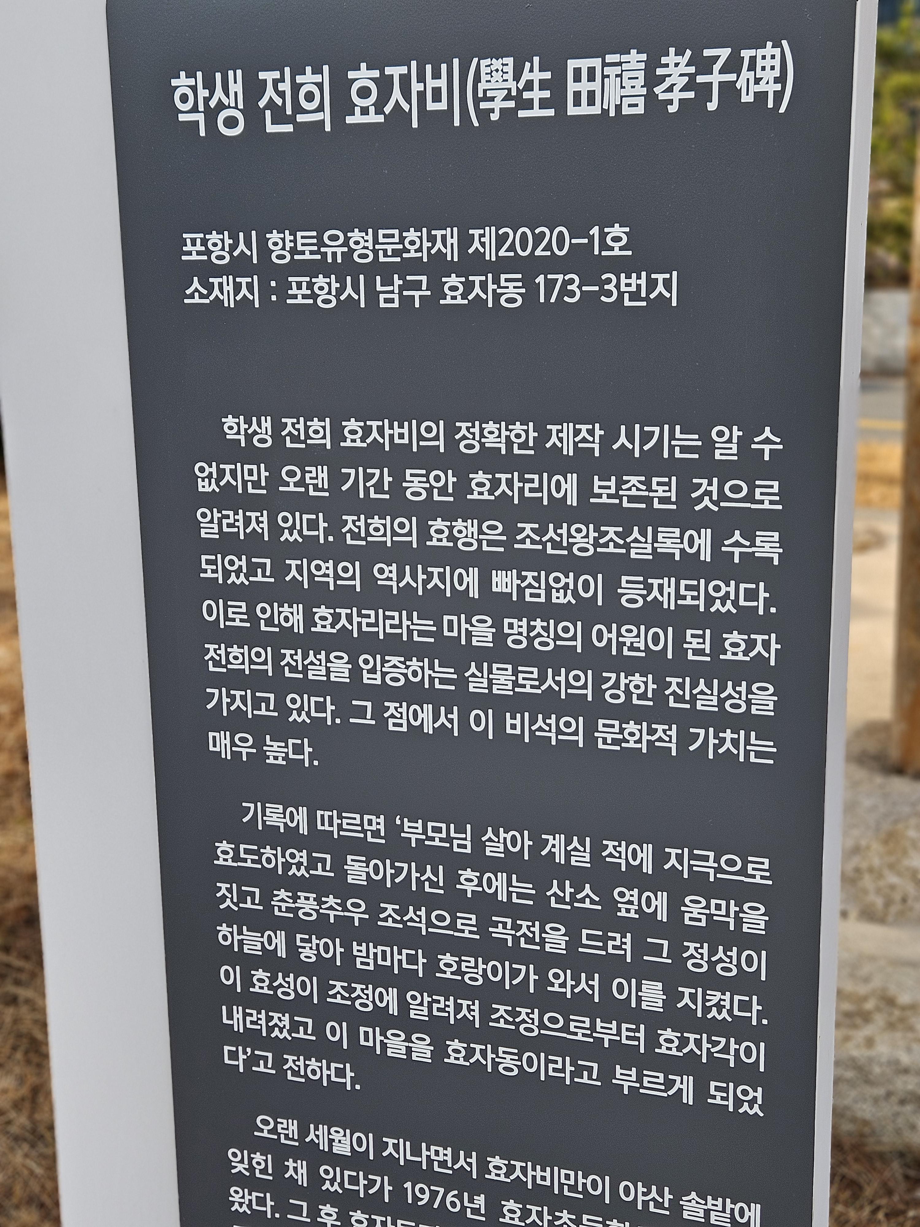 이 효자각은 야산에 잊힌채 있다가 효자초로 옮겨졌다가, 효자 근린공원, 다시 본 위치로 옮겨졌다. - 는 내용.