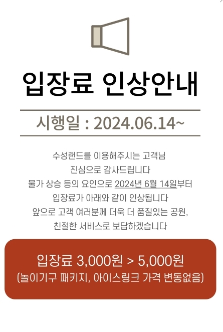 요금 인상을 모르고 방문해서, 어버버 하다 입장료 + 추가 놀이기구 1회권(수성랜드 내부 매점에서 구매)을 끊었더니 5000원 + 추가금 4000원이 듦😇🤑이런 비싼 놀이기구 이용료....
