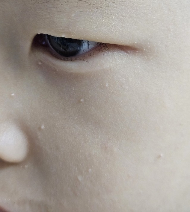 일종의 바이러스 감염으로 인해 생긴 물사마귀(전염성 o). 얼굴의 각질이 제거되지 않고 쌓여 생긴 비립종(전염성x). ➡️ 하얗거나 노랗게 뭔가 차 있어 짜면 나올 것 같으면 비립종. 쥐젖처럼 작은 덩어리가 볼록 튀어나와 짜지지 않을 것 같은 느낌이면 물사마귀.