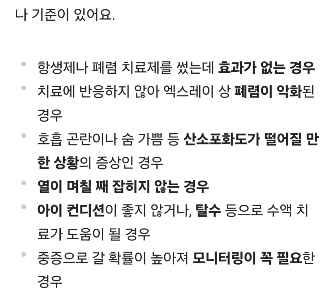 일반 감기처럼 열, 기침이 있었는데 열이 안떨어지고, 아이가 쳐지기 시작해서 일반 감기와 좀 다른 것 같았다. 청진기로 폐 소리가 잡히지는 않지만 위 증상으로 폐렴을 의심했다.