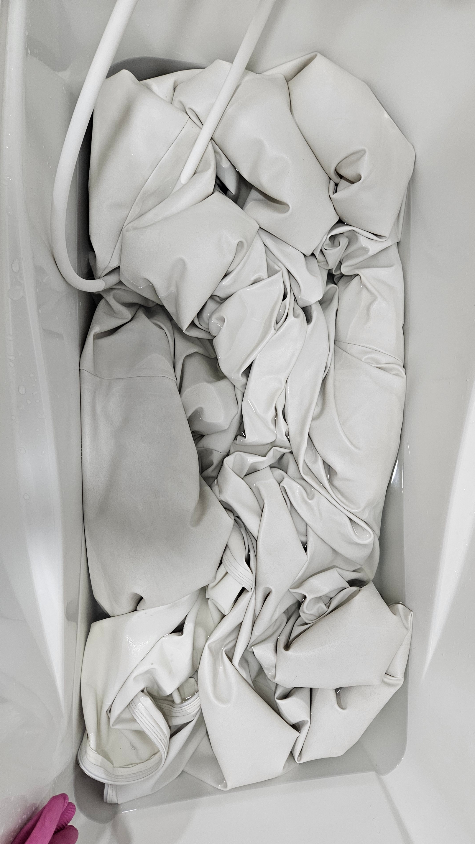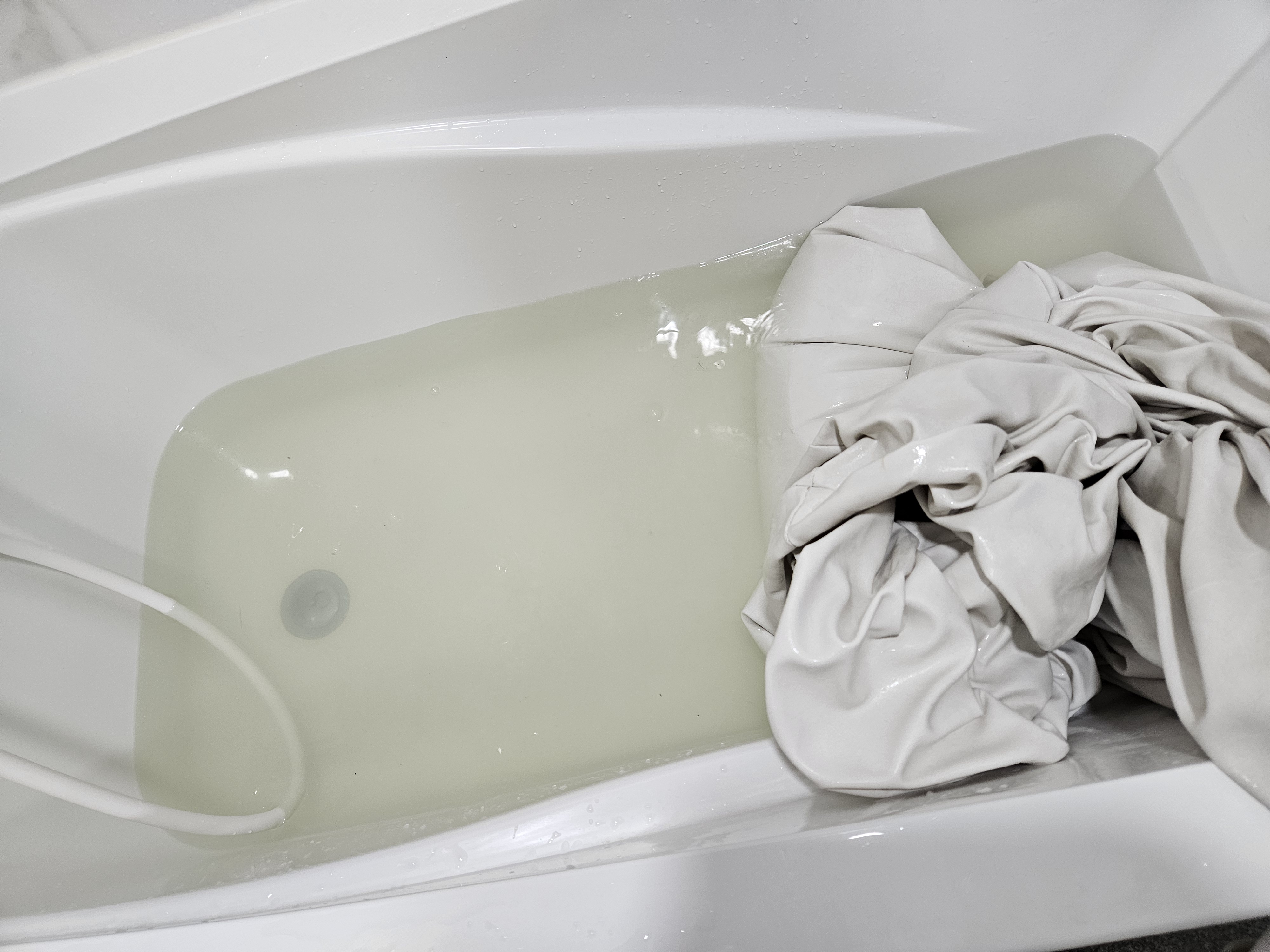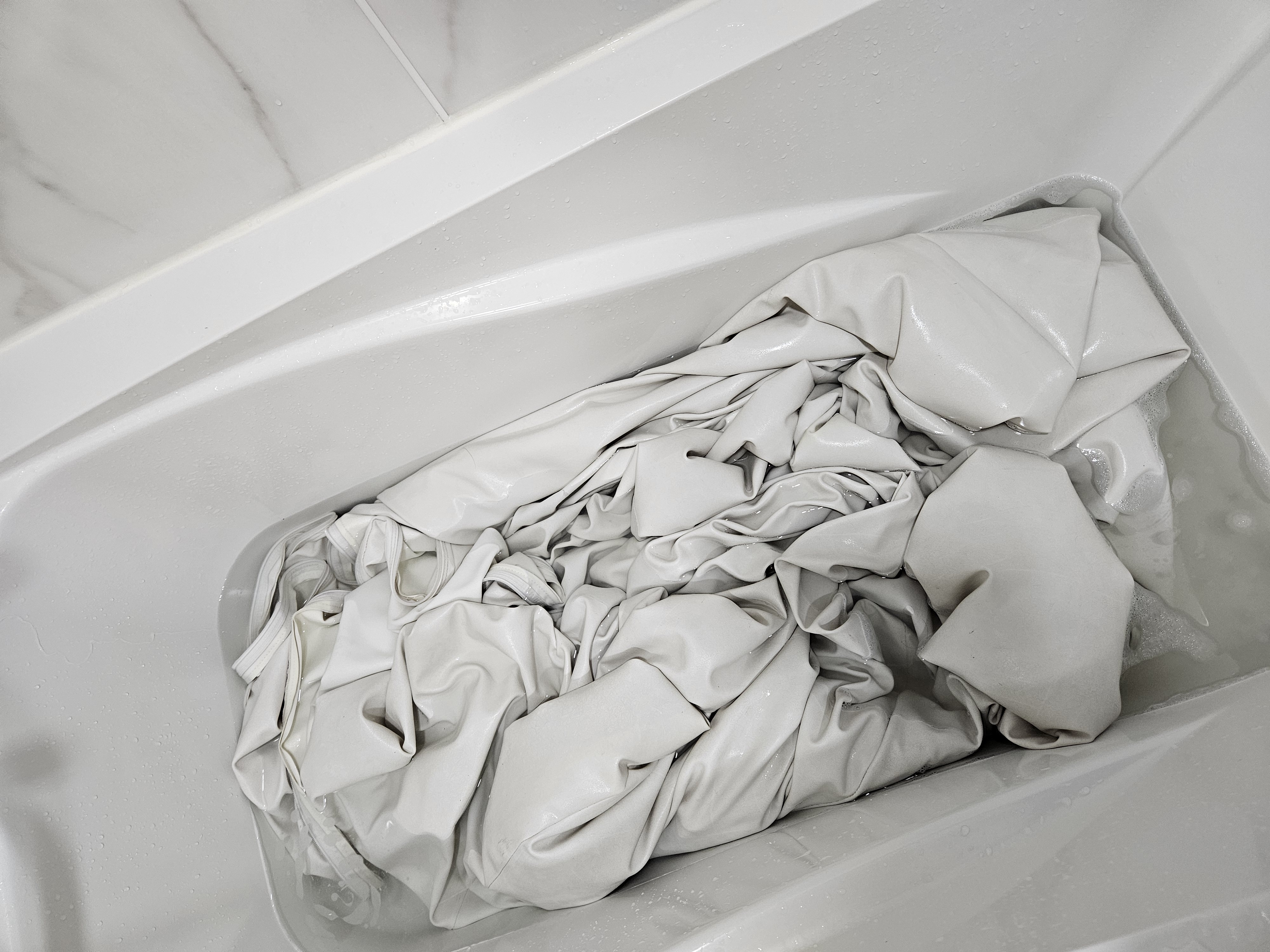 1. 커버 분리 후 욕조에 울샴푸(중성세제), 베이킹 소다를 넣은 물에 담그어 준다.