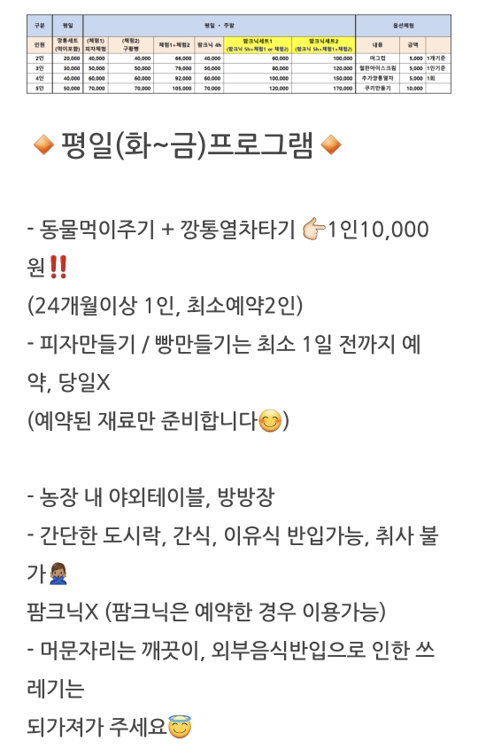 주요 프로그램인 깡통세트(동물먹이주기 + 깡통열차타기), 1인 1만원에 추가프로그램 가능.