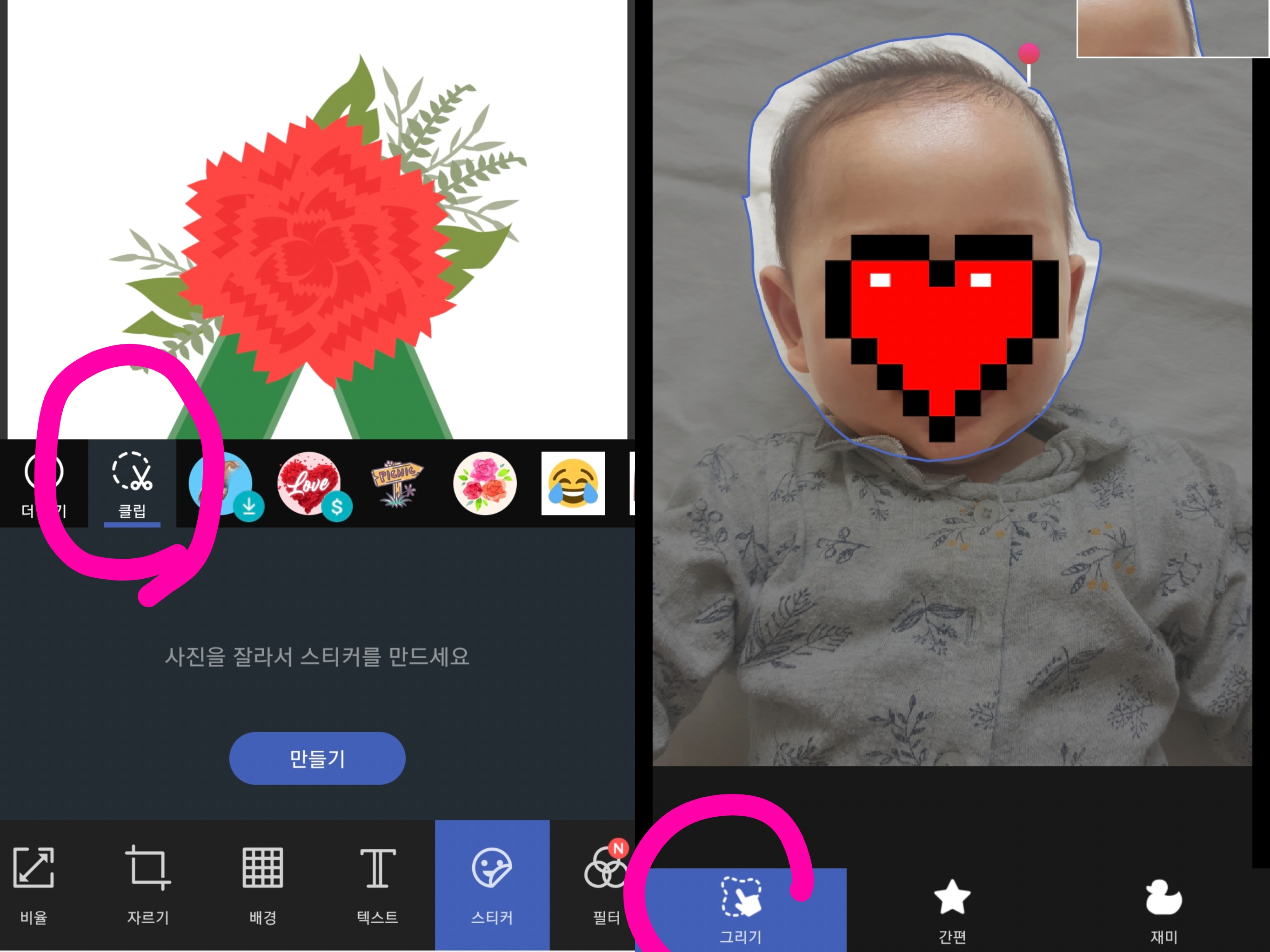 2. 아기 사진 선택하여 '그리기' 로 얼굴 잘라내기
