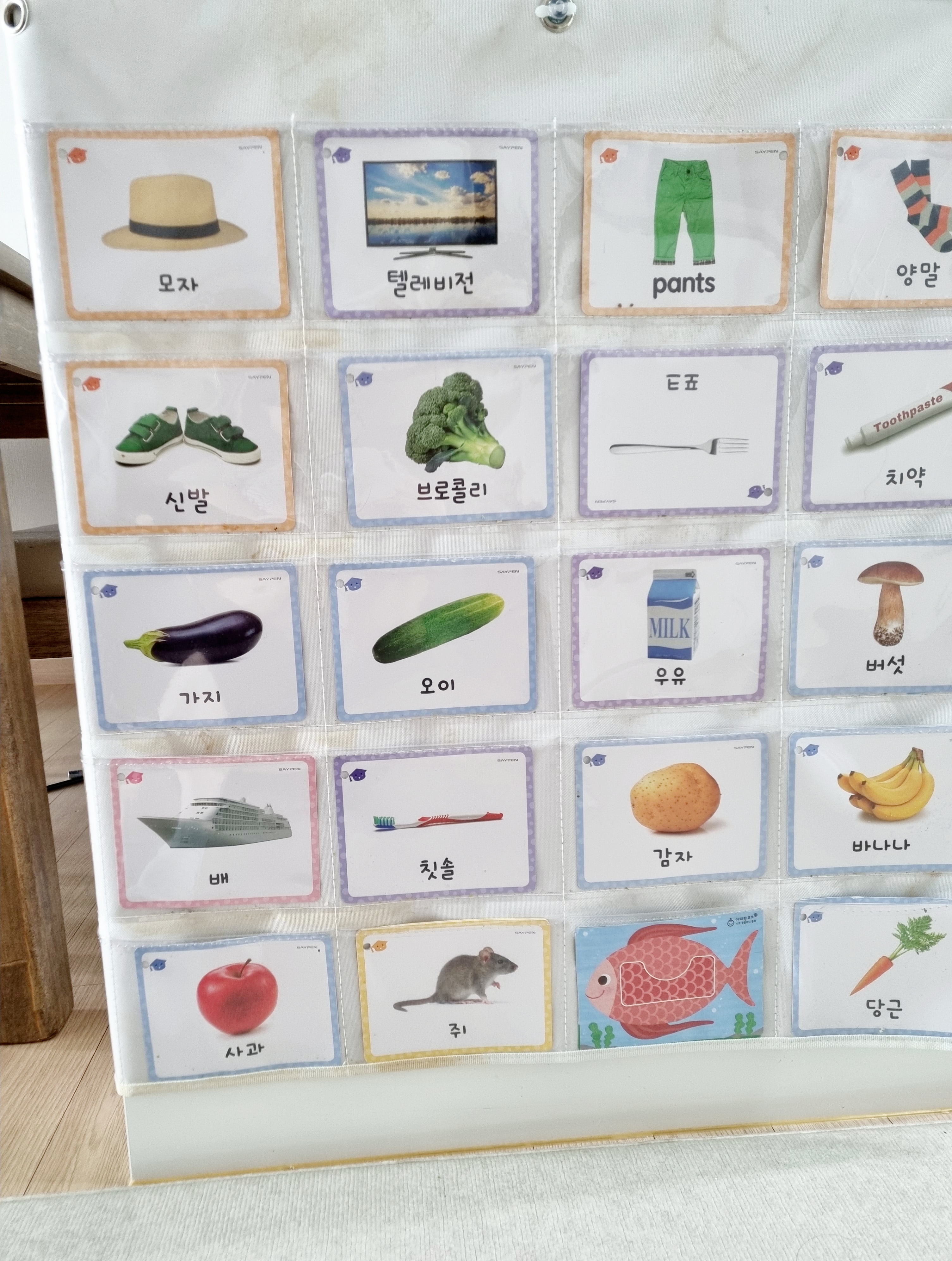 장점 : 어디든 부착 쉬움(저희집의 경우 부엌 아일랜드 식탁 아래), 원하는 낱말 카드 쉽게 끼웠다뺐다