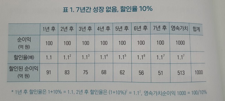 올해 순이익이 100억인 기업이 있다. 이 기업은 성장하지 않고 매년 100억원의 이익을 내고 100억원을 배당으로 나누어 준다. 할인율 10%를 적용하면 이 기업의 가치는 다음 표와 같다.
