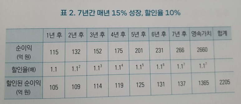 순이익이 100억원이고 향후 7년간 매년 15% 성장하는 기업, 8년째부터는 성장이 멈추고 유지되며, 할인율은 10%