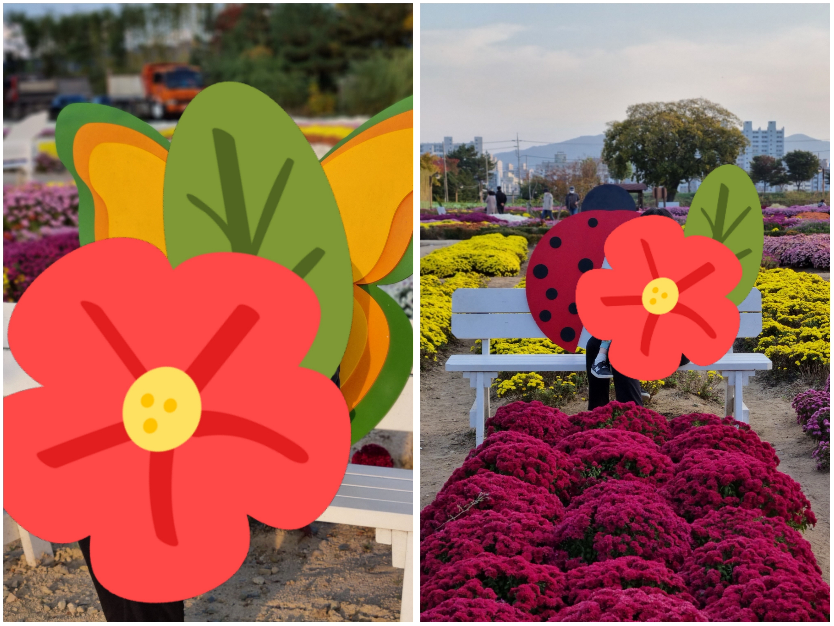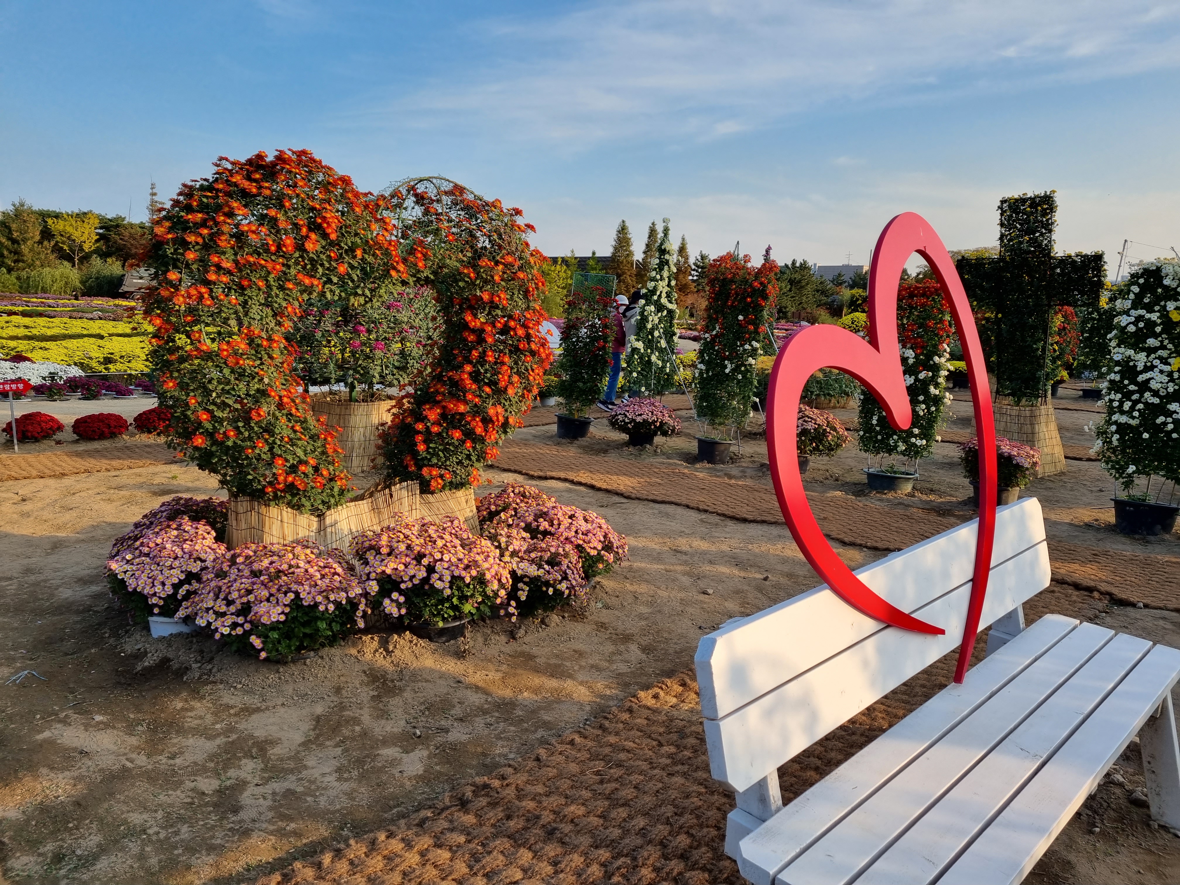 곳곳에 저렇게 벤치에 앉아서 사진을 남길 수 있는 국화분재, 포토스팟이 조성되어있습니다. 지난주보다 국화도 많이 폈고 정말 한창인 모습이였어요!