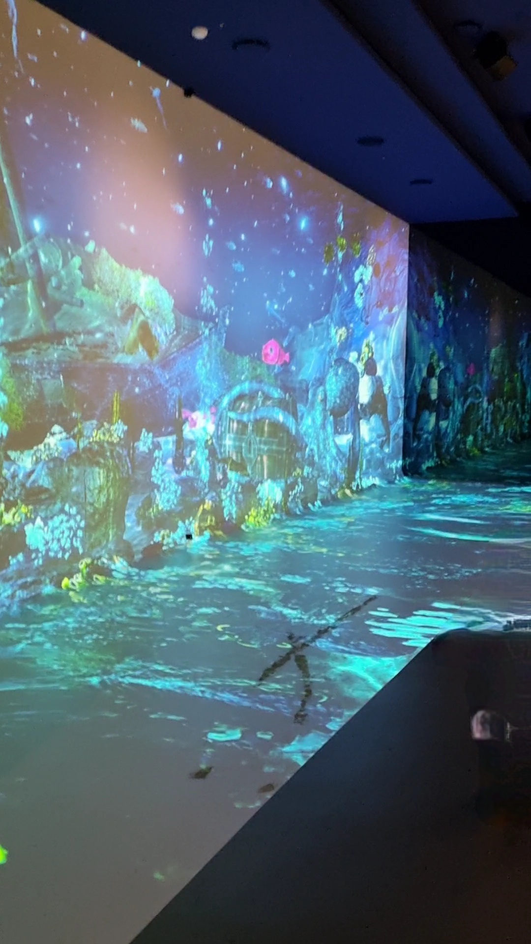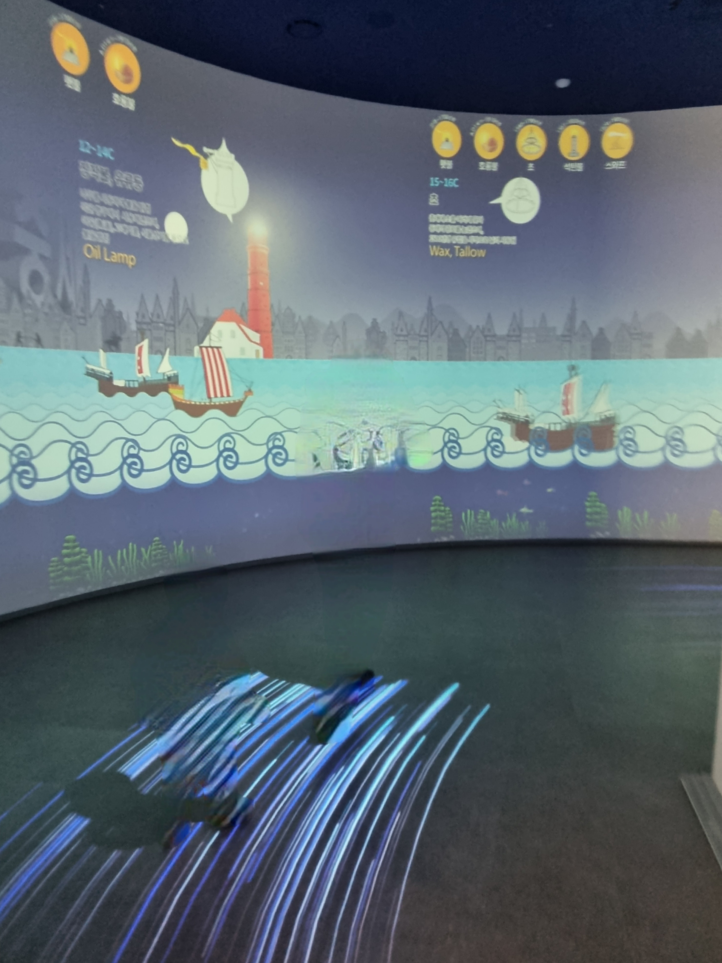 바닥의 조개나 벽면의 물고기를 건드리면 띠용! 띠용! 소리가 났어요. 신나서 쫓아다니며 구경하고 눌러보고 하네요~! 꽤나 좋아해서, 앞으로 갔다가 이 전시를 다시 보러 되돌아왔었습니다. 이 장면말고도 시간이 지나니 배를 띄운 장면, 낮의 바다 등 장면이 바뀌었습니다.
