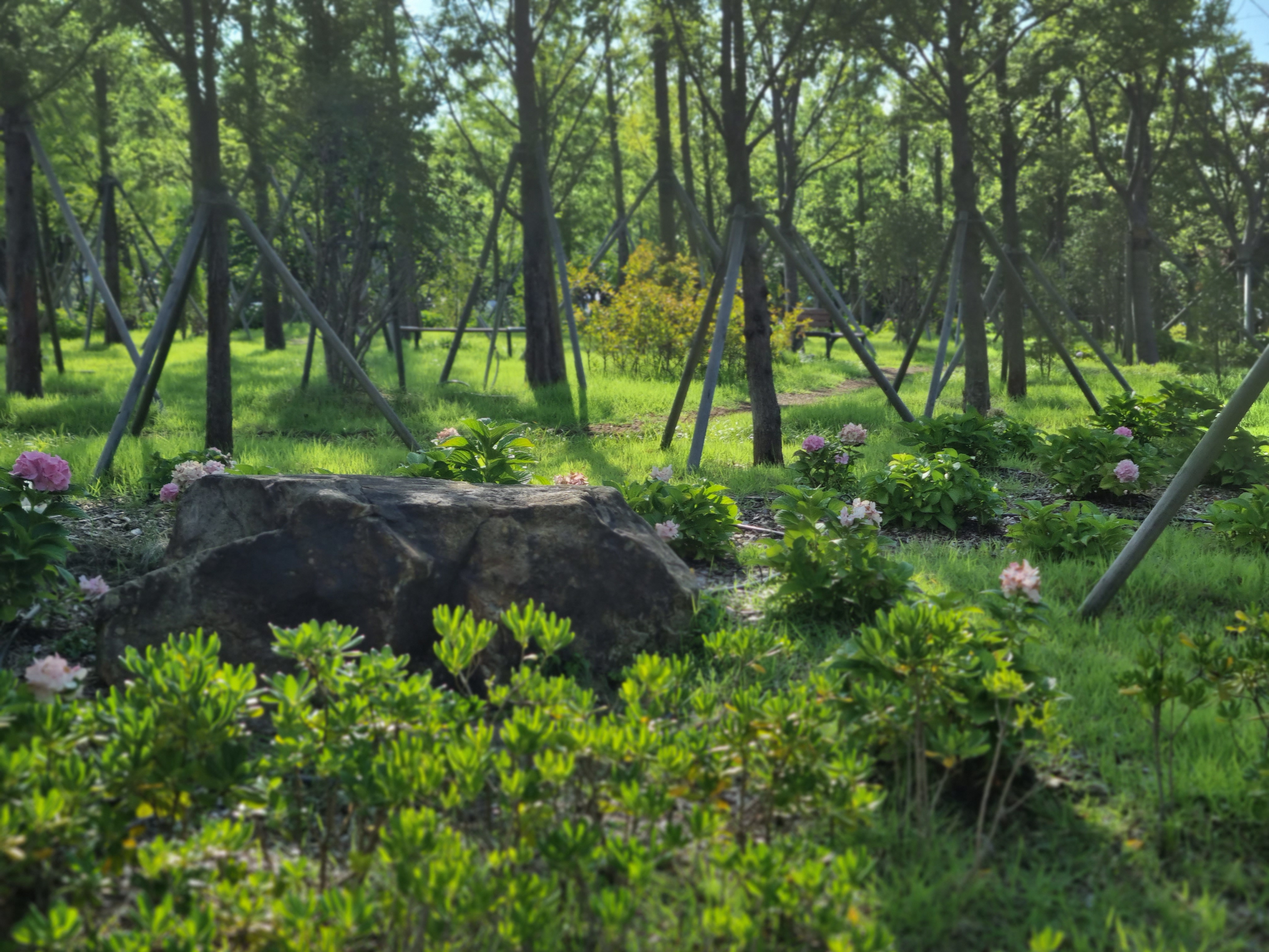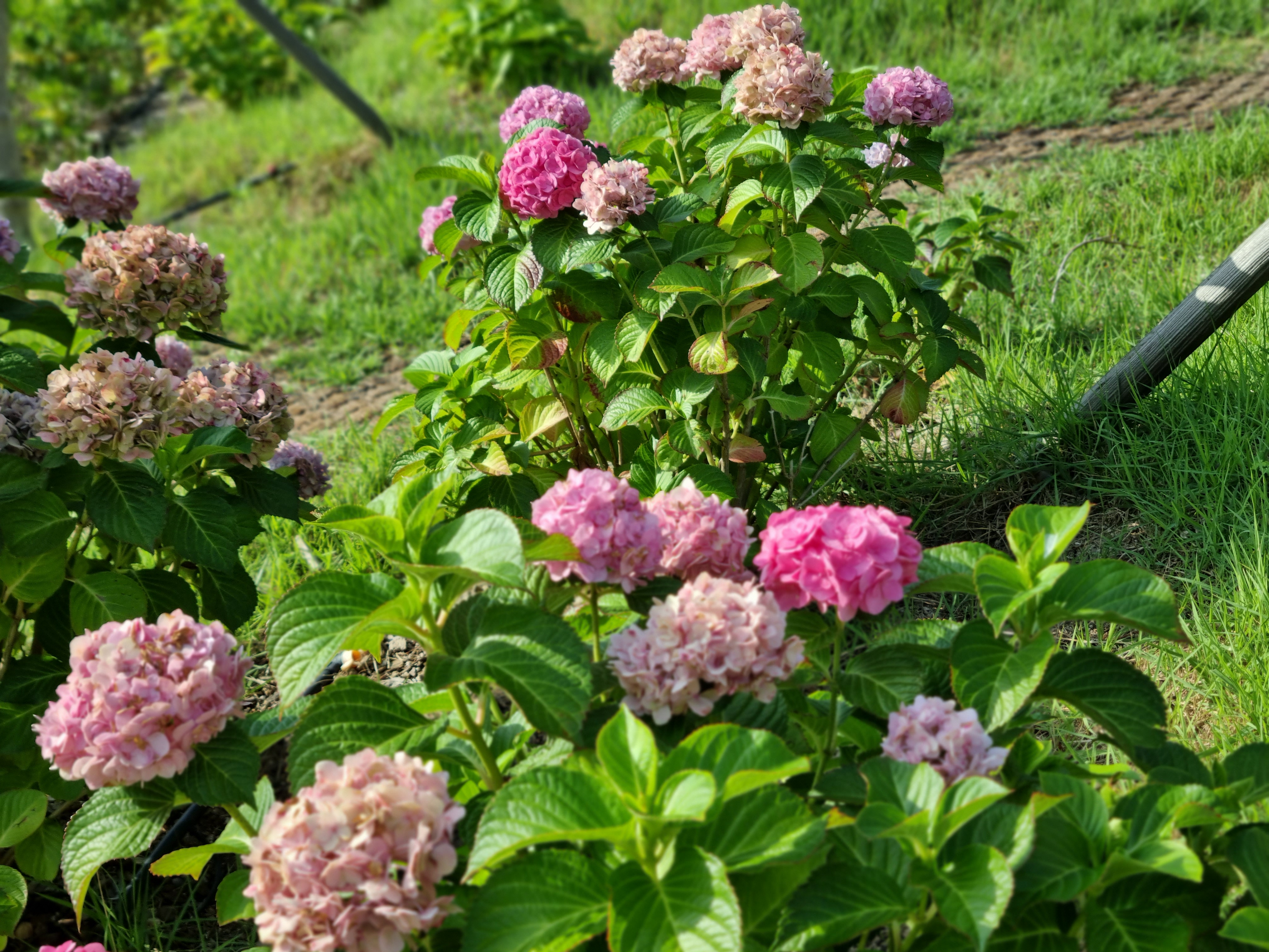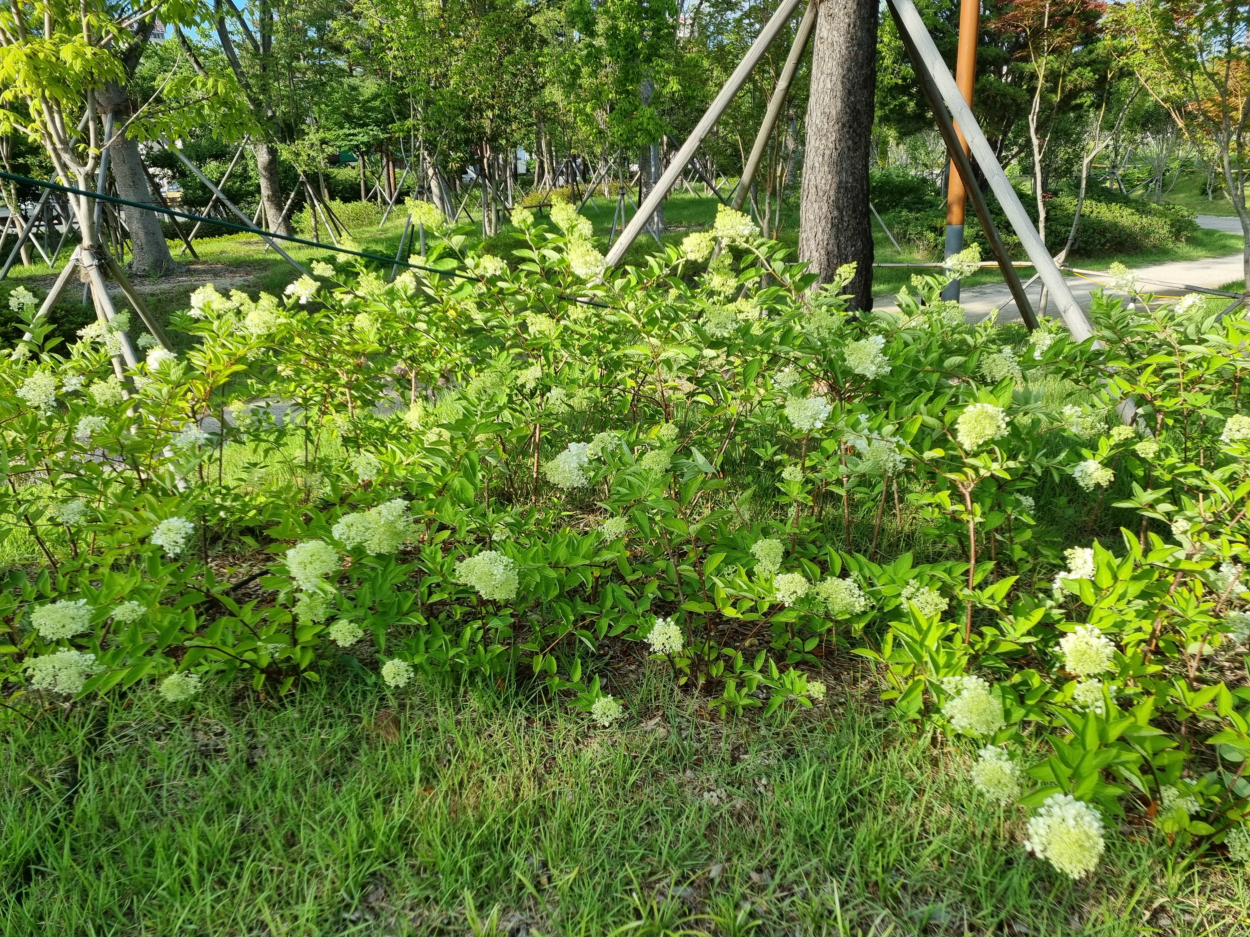 여름에도 예쁜. 수국꽃이 심겼다! 철길숲에도 심기고, 여기저기 포항 심기는 모습. 가까운 발치에 심겨서 아이 손에 잘 닿음. 덥지만 그래도 아직은 그늘에 들어가면 선선한 날씨.
