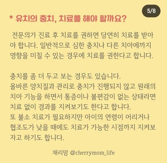 9. 유치 충치 치료; 심하지 않으면 관리하며 두고보는 편.