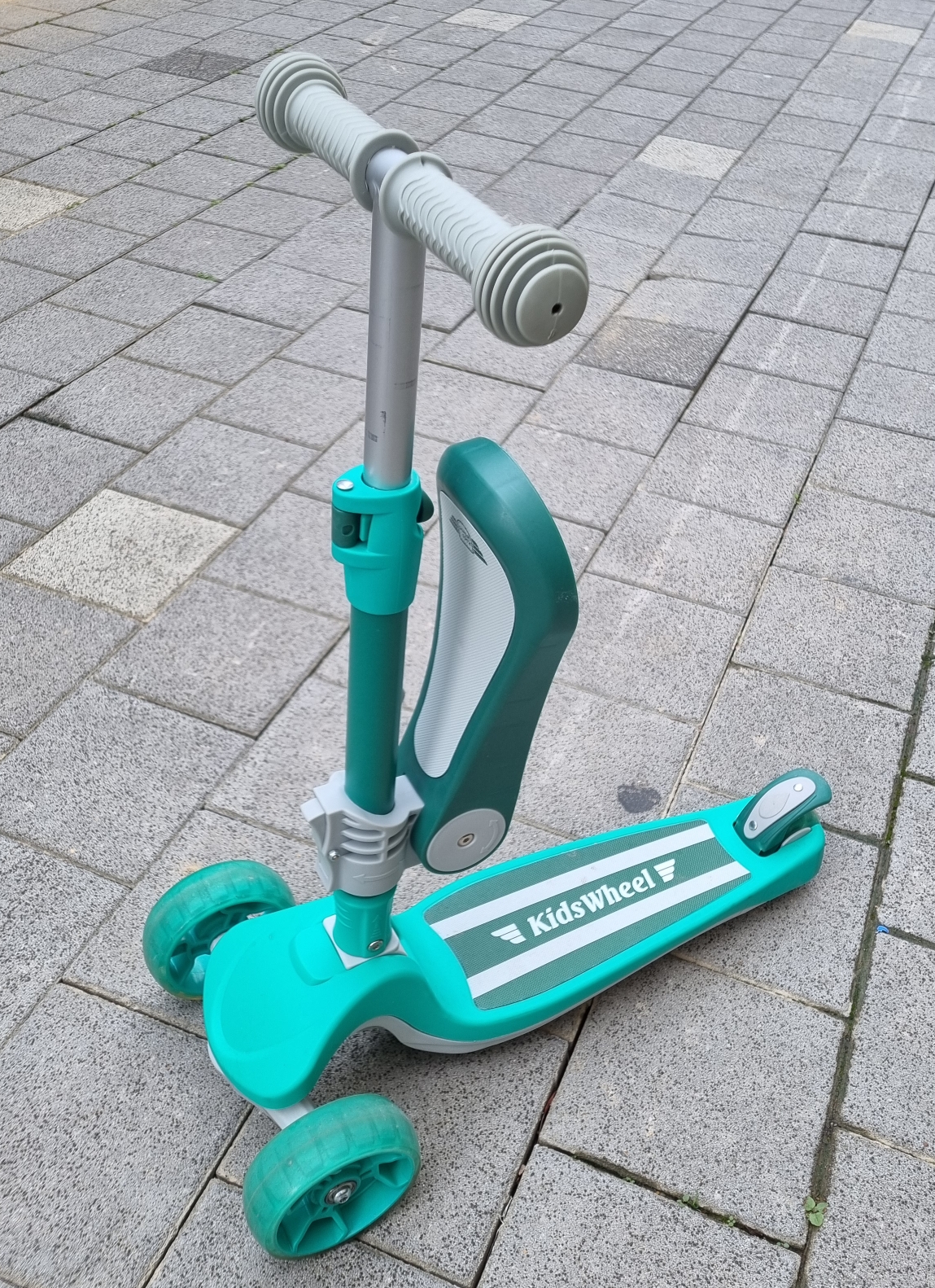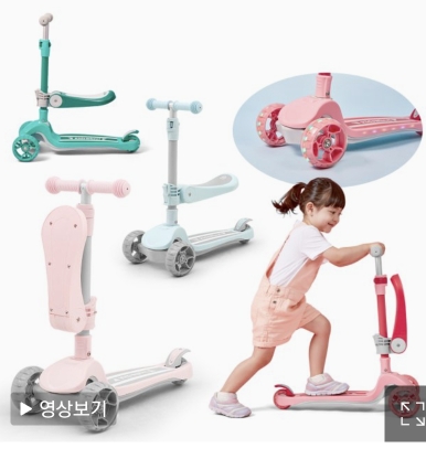 장: 앉아서 탈 수 있는 안장(접이식 안장)을 안 떼고 올렸다 내렸다 할 수 있음. 방향전환이 휙휙 되는게 아니라서 오히려 안전하기도. 비비드한 그린 색상, 파스텔톤 색상.