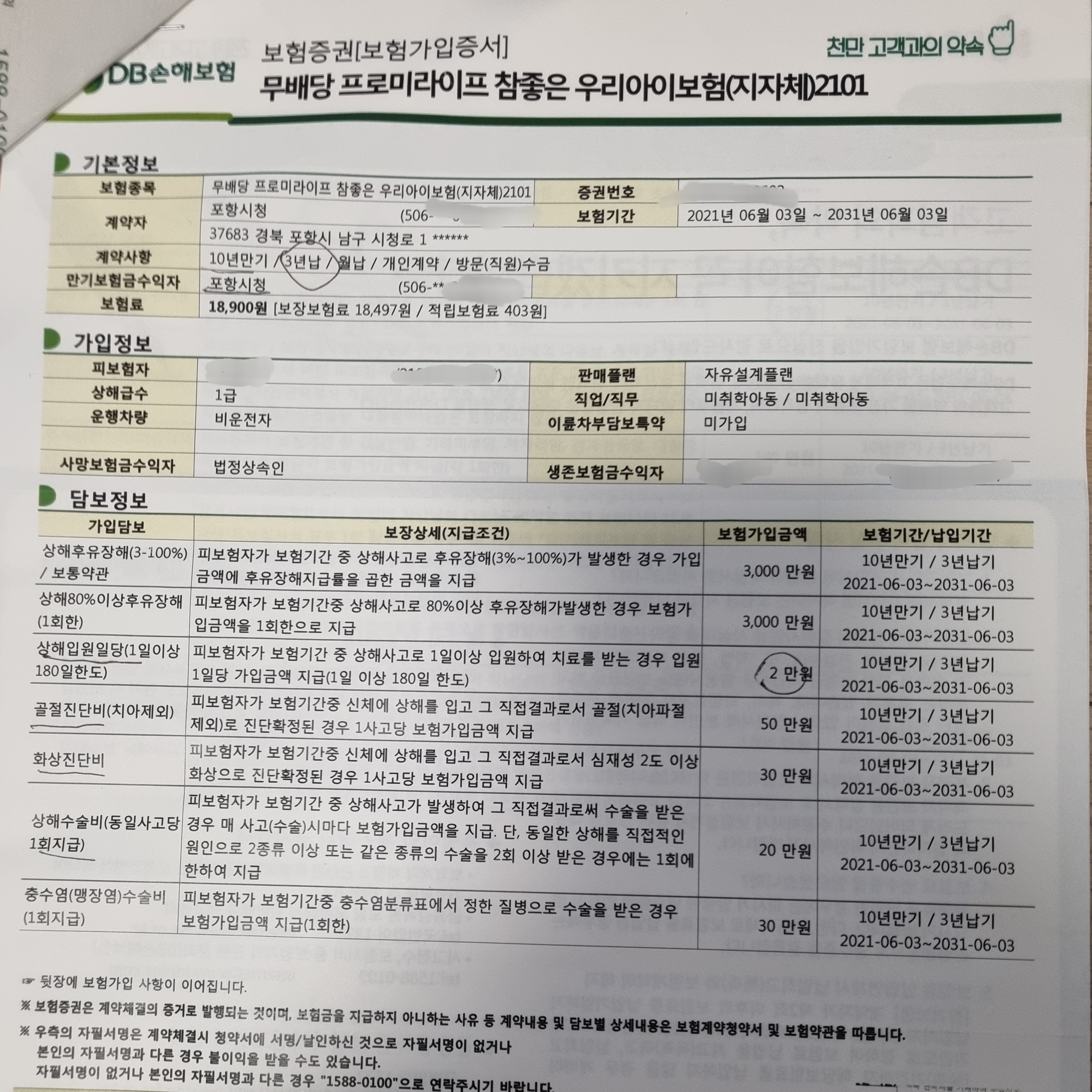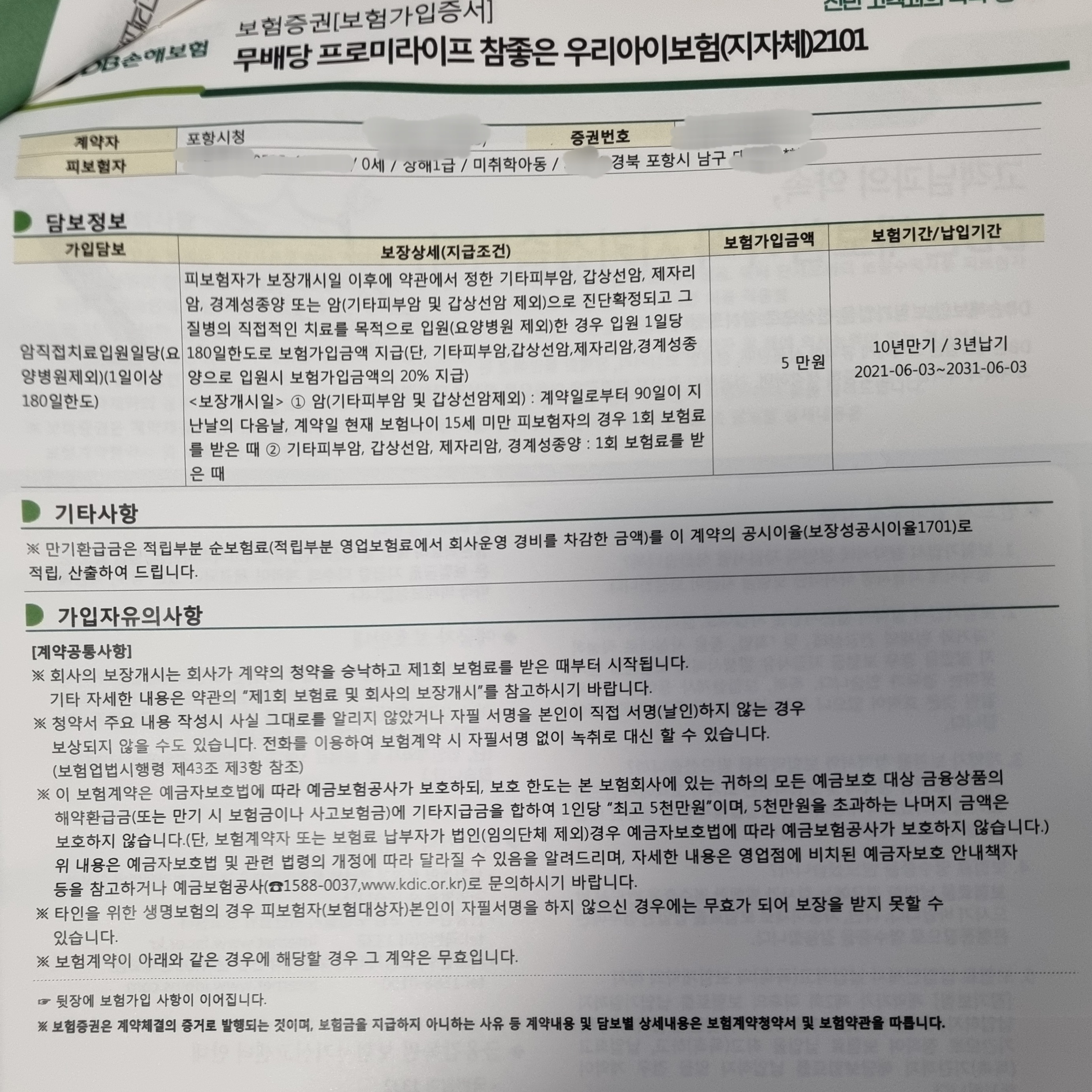 - 3년간 포항시에서 달 18,900원의 보험료를 납부해주고, 보장 기한은 10년입니다.