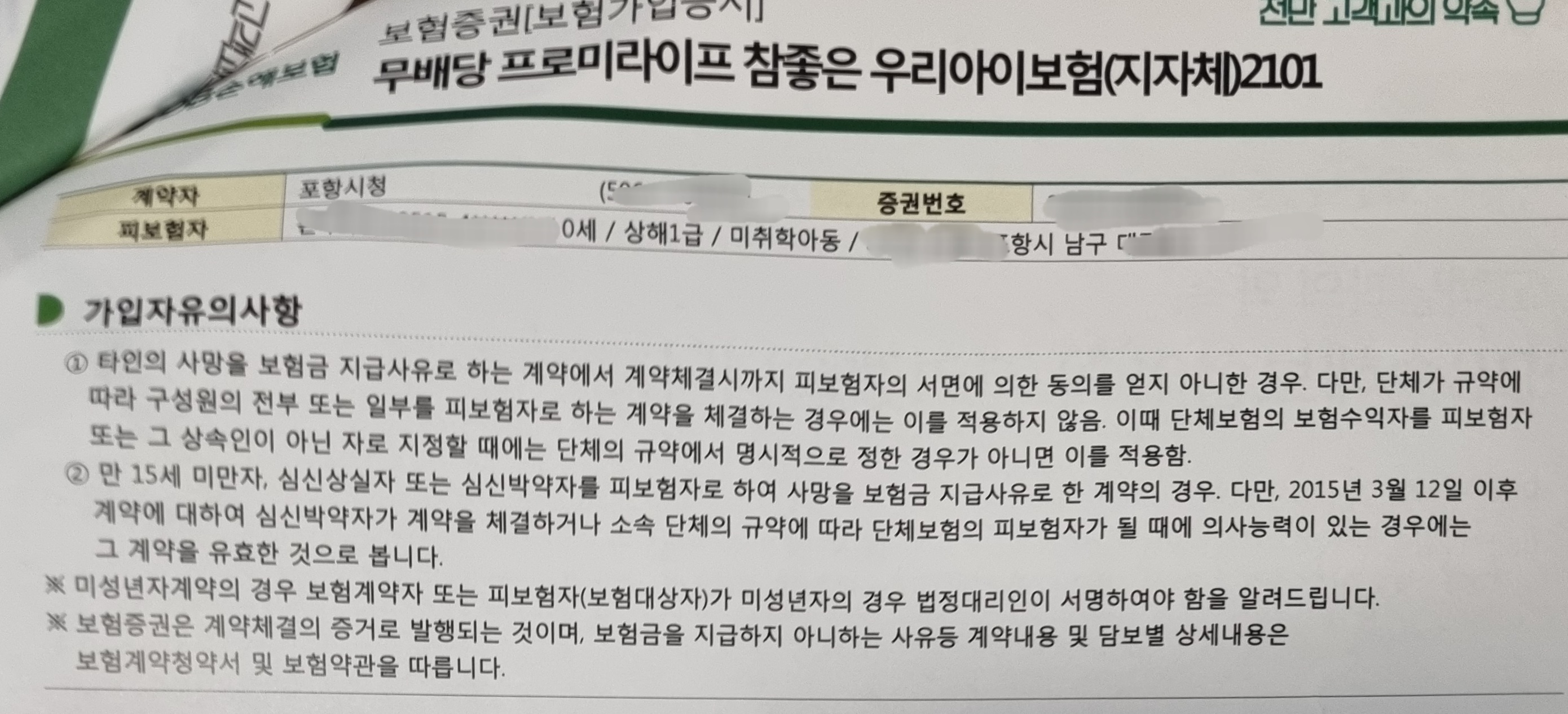 그래도 일단은 21년생 둘째까지는 포항시에서 본 보험에 가입해주었으니 -