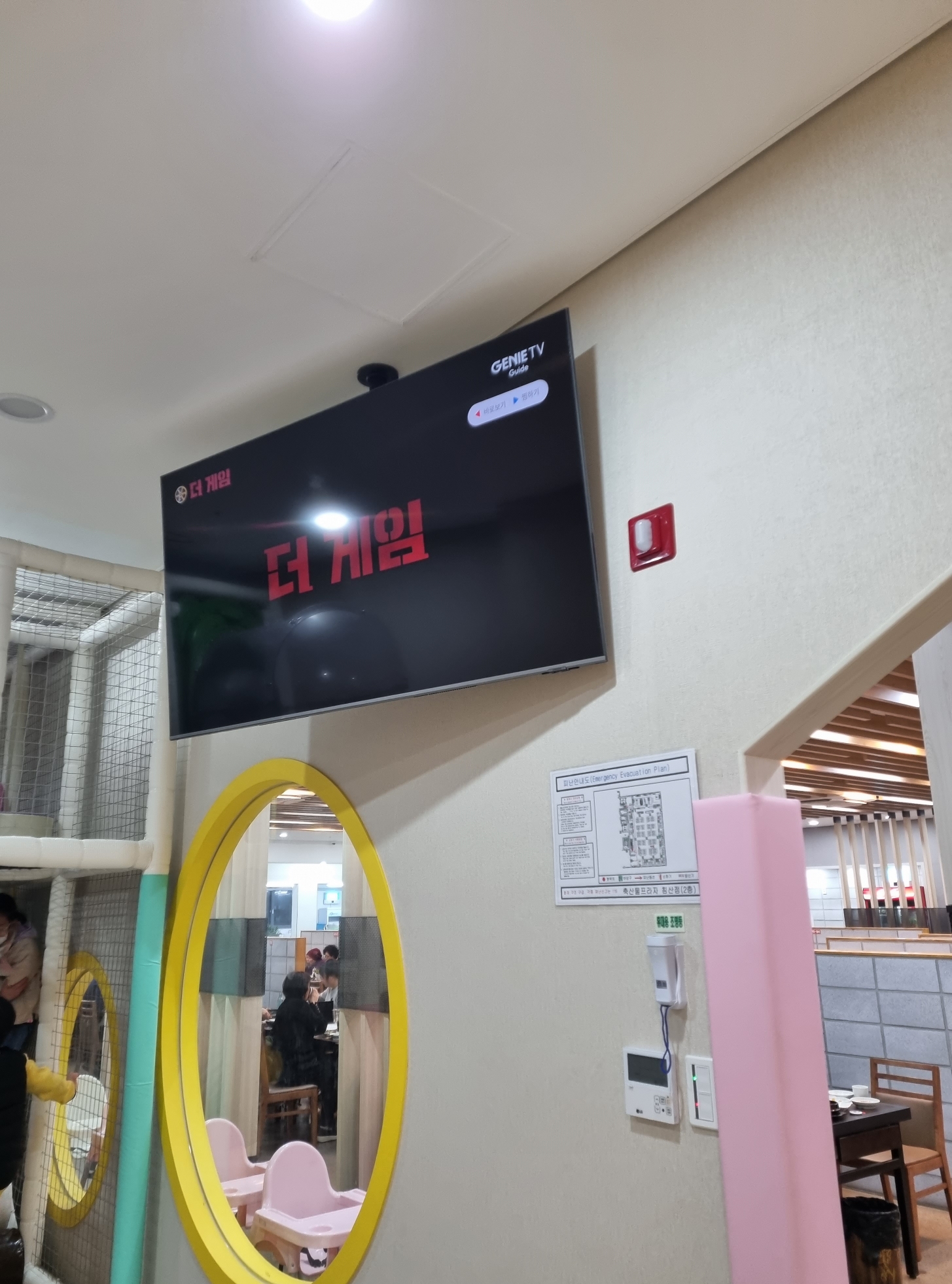 ▪️아이들이 놀이방에서 노는 동안, 어른들이 대기+지켜보며 볼 수 있는 tv 화면도 있습니다.