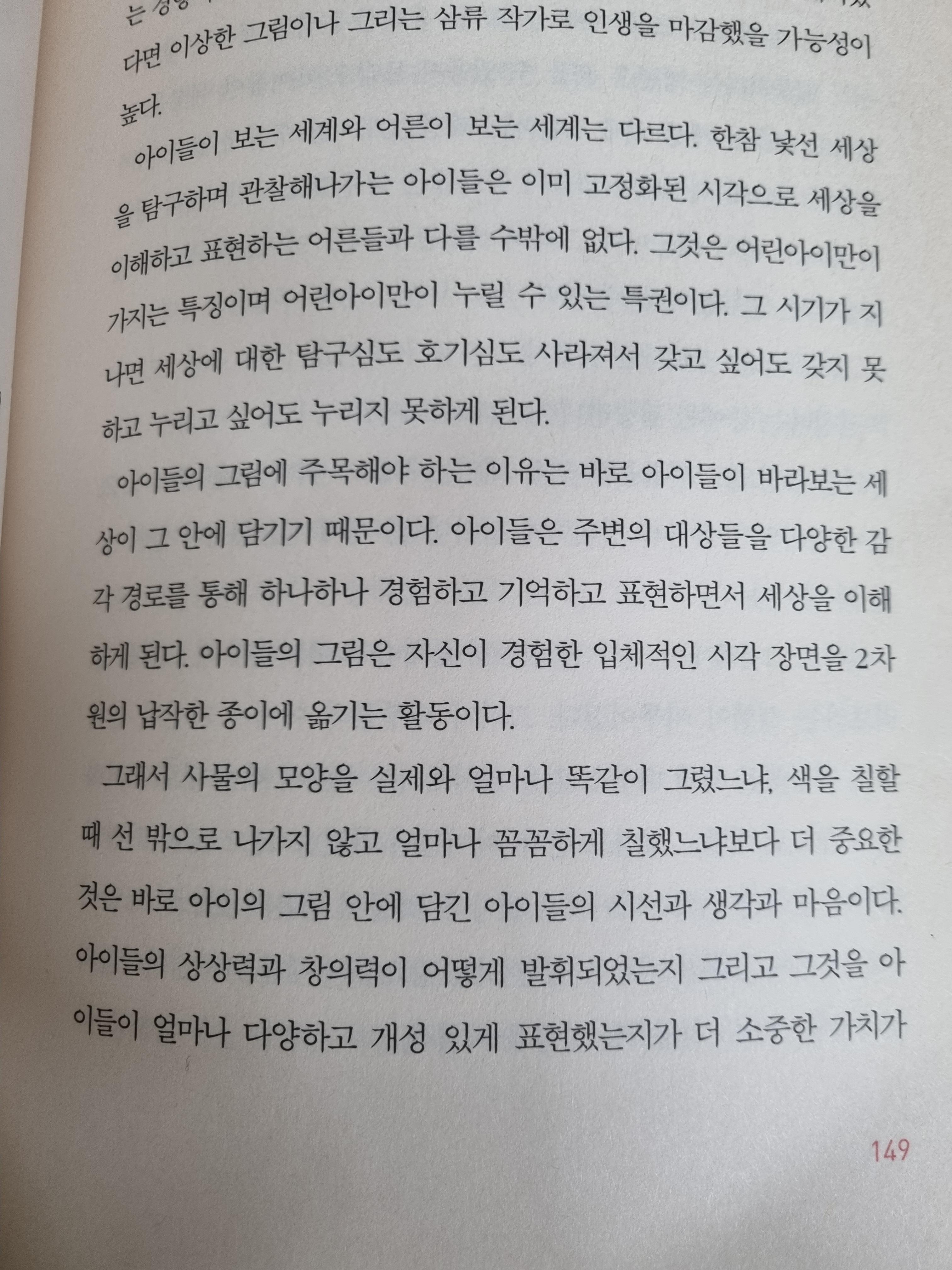 2-3세의 그림 교육은 그림 그리는 법을 가르치는 것이 아니라 상상하고 창의력을 키우는 예술 활동. 이러한 어린시절 창의적인 미술 교육이 아이의 머리를 유연하게 만든다고 믿는다. 머리가 유연해지면 아이의 상상력은 단순한 공상을 넘어 생각을 실현화하고 현실화 시킬 수 있는 것이다.