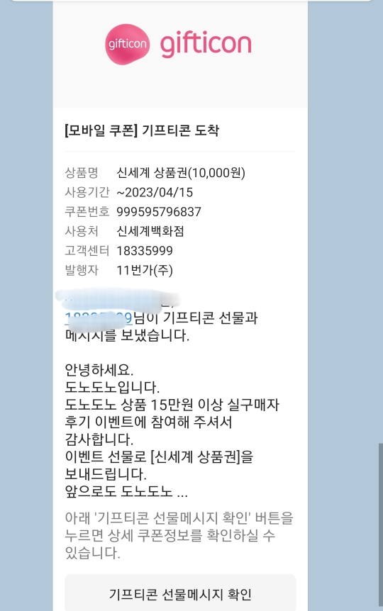 3월 중순 경, 실제로 기프티콘 1만원권 받음.