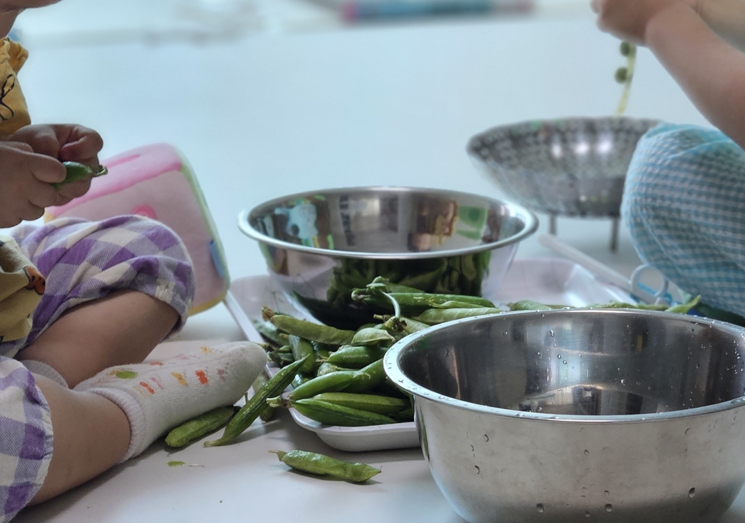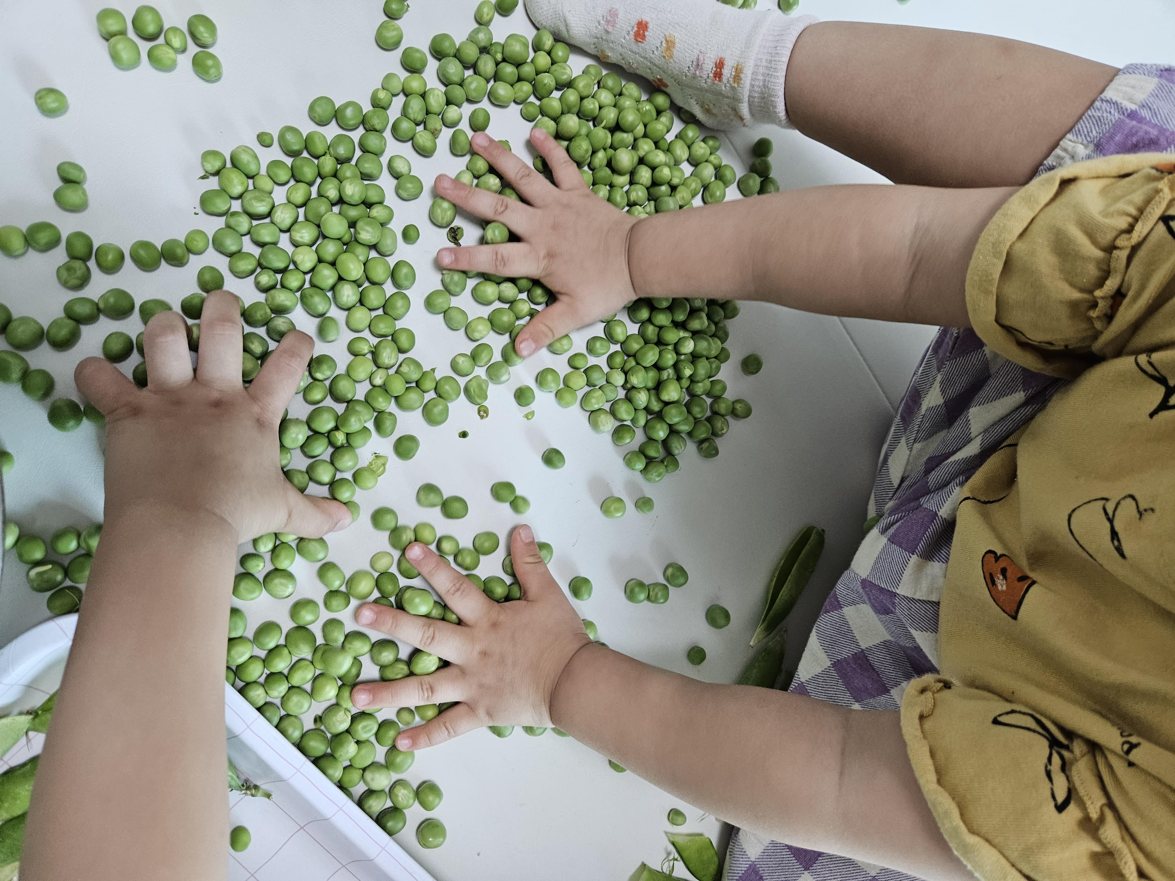 어른이라면 콩깍지가 반 열리게 꼬집어 뜯듯이 뜯어 아예 콩깍지를 반으로 가를텐데 아이에게는 쉽지 않아 보임.
